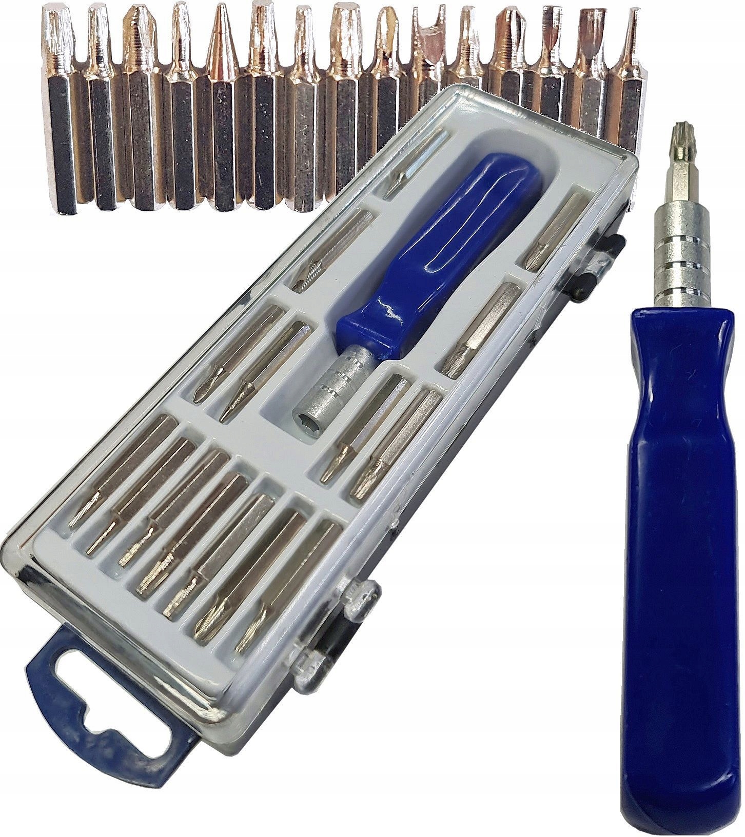 Окрутняя имеет заменяемые биты с точными наконечниками заземления. Глоты, изготовленные из закаленной стали Ni-CR-MO. Набор упакован в эстетический и функциональный случай.