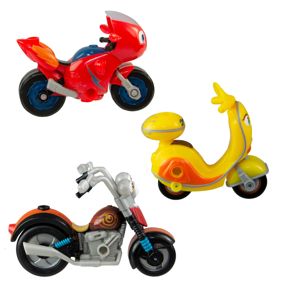 Соберите коллекцию главных героев мультфильма «Рики Зум» и участвуйте в великолепных гонках! В набор «Рикки Зум» входят: 3 коллекционные фигурки мотоциклов с индивидуальным внешним видом: Рикки (8 см), Скутио (6 см) и Максвелл (10 см).