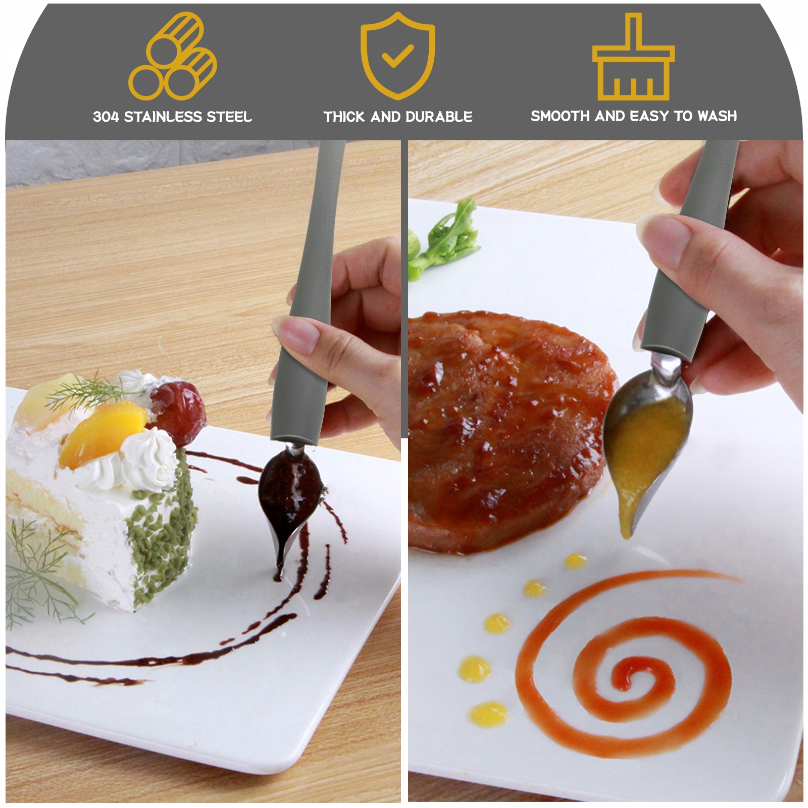 Изготовлен из высококачественной нержавеющей стали, устойчив к ржавчине, коррозии, прочен и долговечен в использовании. Предназначен для профессионального использования, хороший инструмент для украшения блюд. Наш набор декоративных ложек станет хорошим помощником в приготовлении изысканных блюд. Просто наполните ложку соусом и нарисуйте свой рисунок.