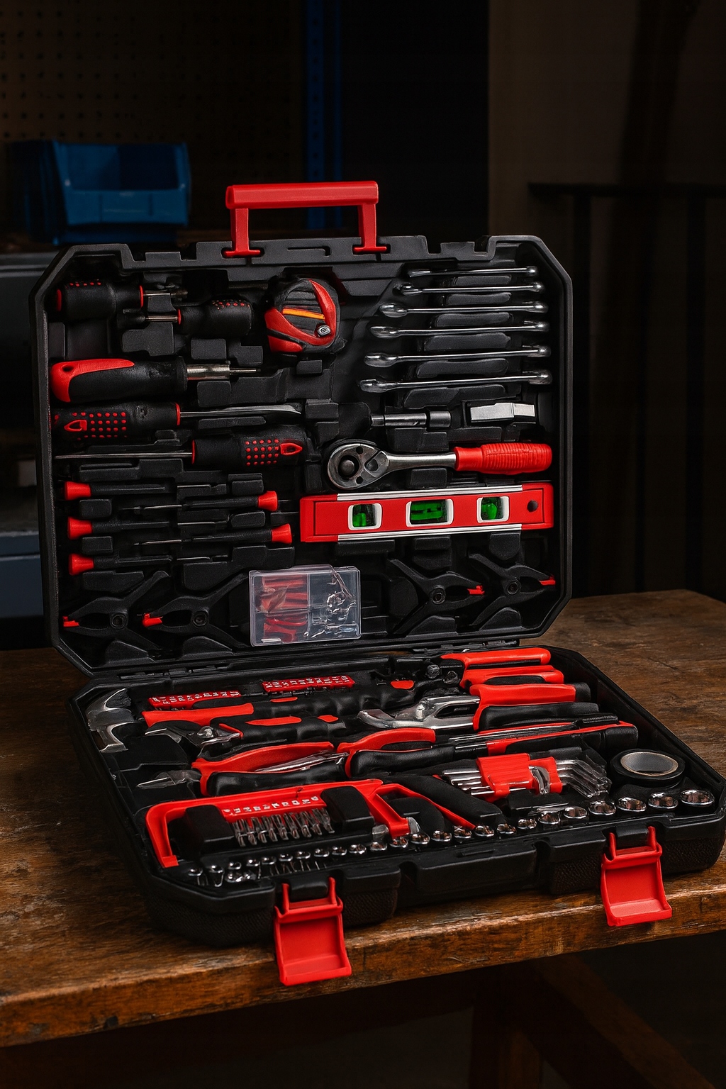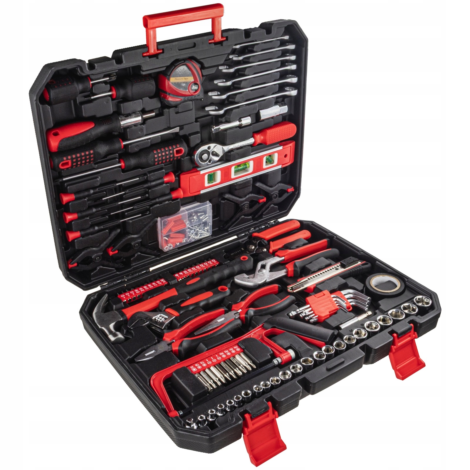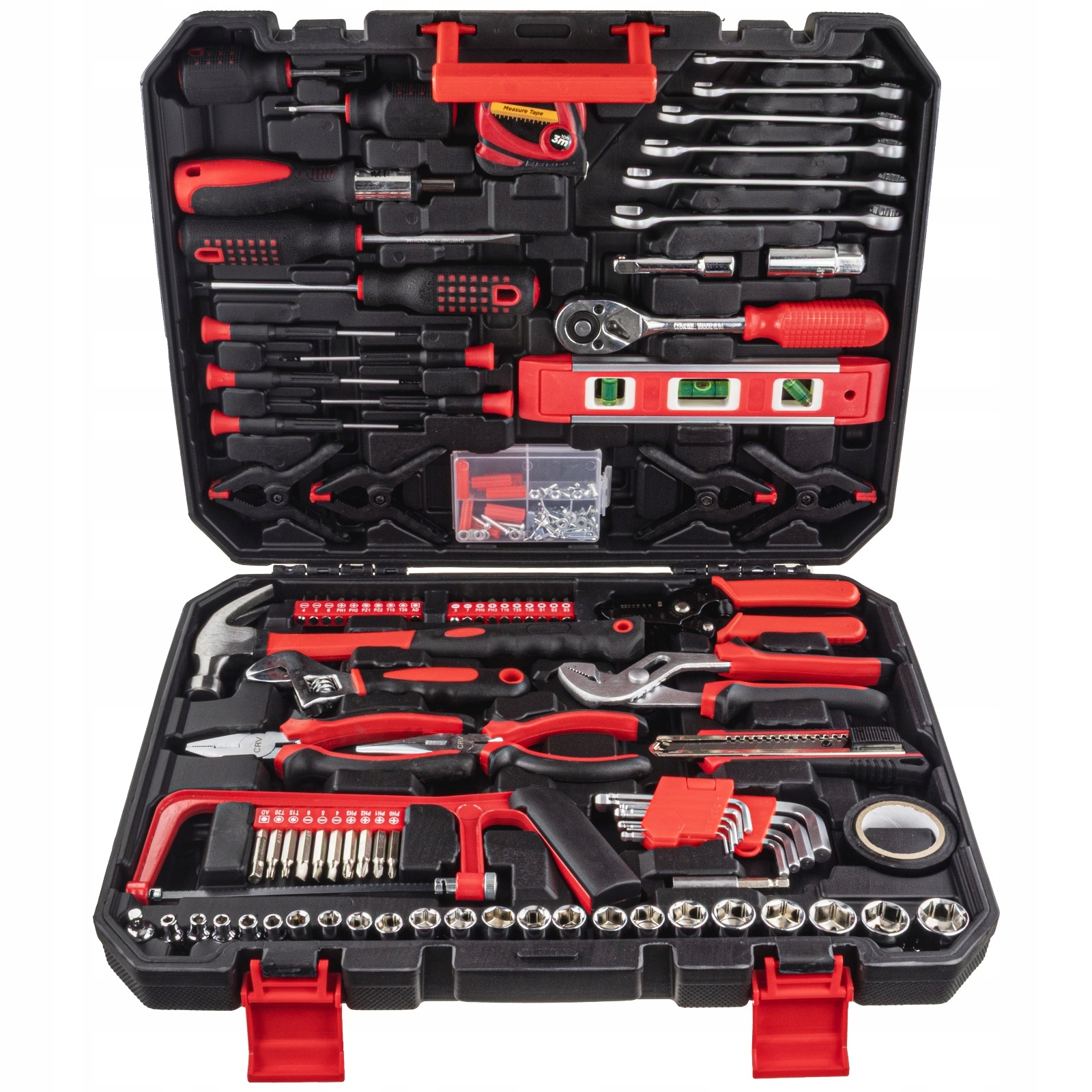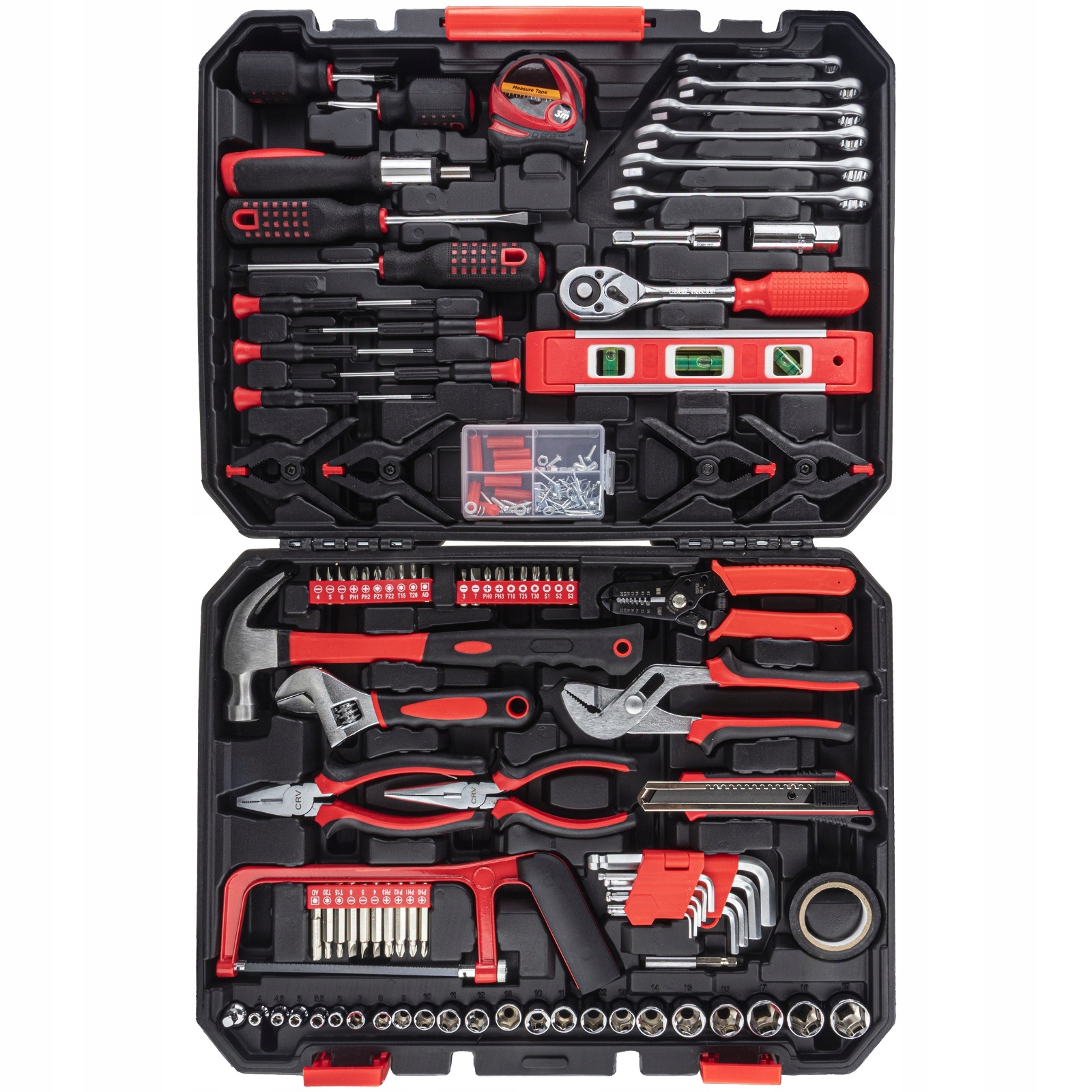 ⭐ В набор входят как инструменты для механических работ (торцевые головки, трещотки, гаечные ключи), так и небольшой прецизионный или столярный инструмент (пила, молоток, спиртовой уровень).