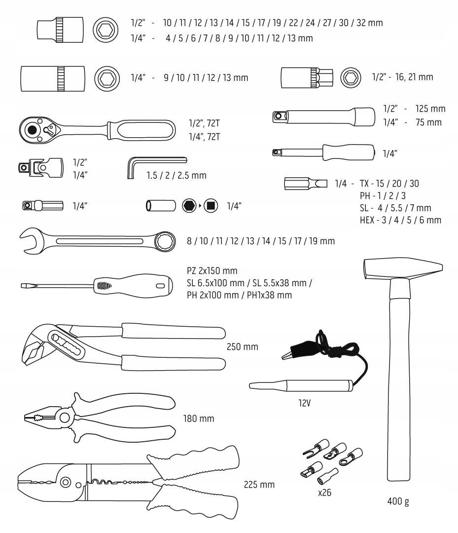 - Цокольчик в комплекте: 1/2 "шестигранник, 13 шт.: 10, 11, 12, 13, 14, 15, 17, 19, 22, 24, 27, 30, 32 мм.