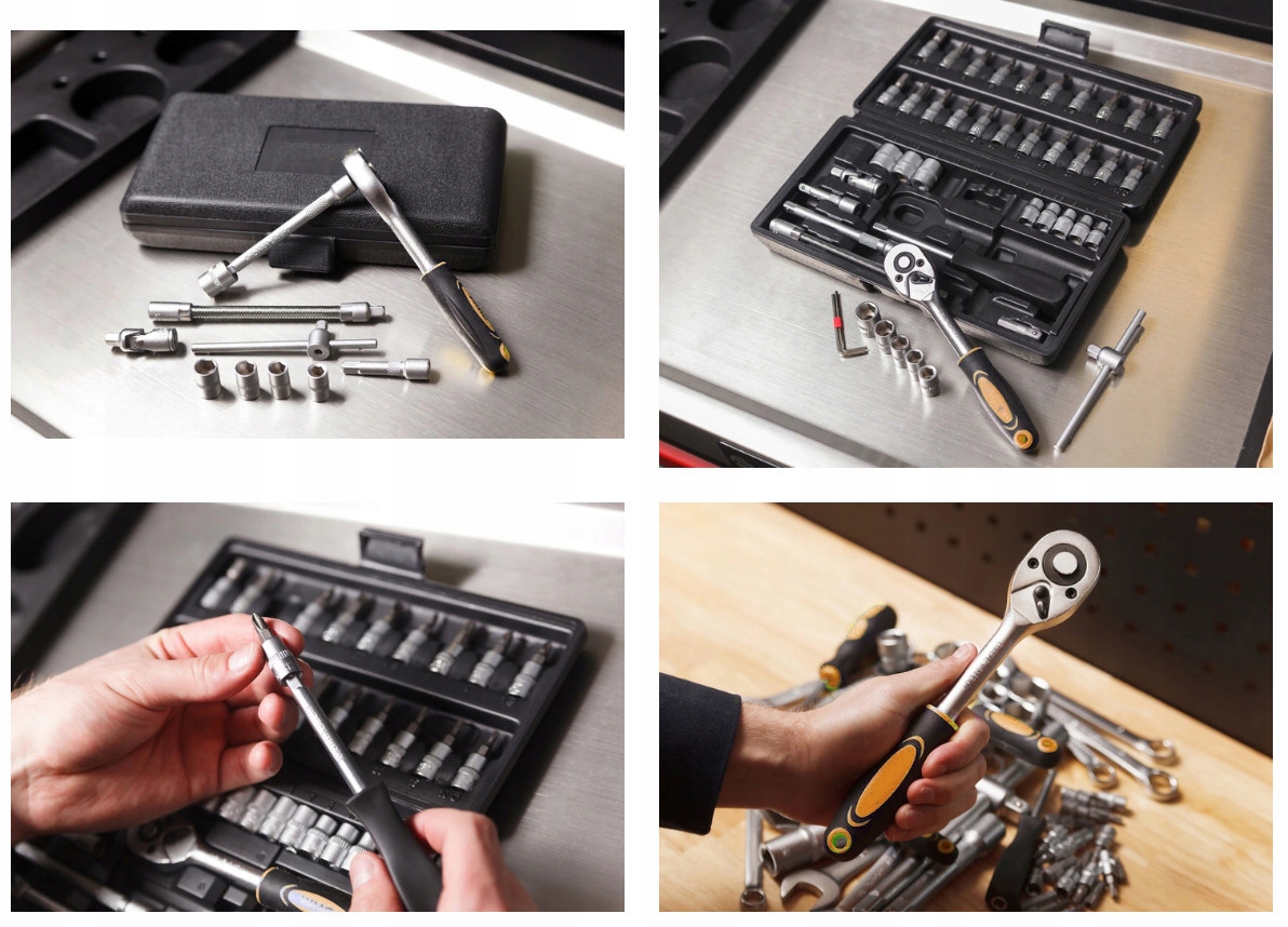 Набор торцевых ключей на 1/4 дюйма состоит из 46 элементов, изготовленных из высококачественной хромованадиевой стали.