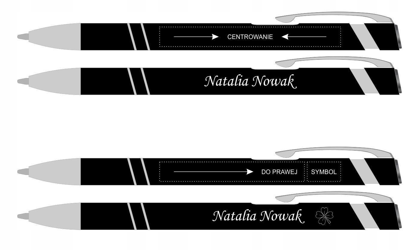 Мы выполним лазерную гравировку пишущих элементов с вашим изображением. имя и фамилия или короткий текст с возможным дополнительным графическим символом из нашей галереи (галерея далее в описании).