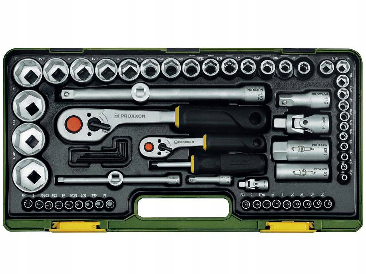 - Профессиональный набор PROXXON с трещотками- дубинками 1/2" и 1/4", 65 штук.