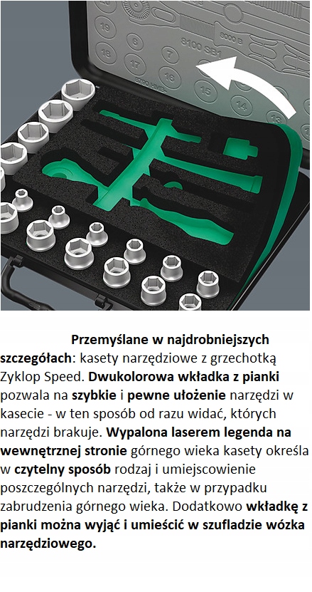 Набор Zyklop из 42 предметов в прочном металлическом футляре: трещотка Zyklop с приводом 1/4 дюйма. Мелкий шаг, 72 зубца, обеспечивающие небольшой рабочий угол 5°. Трещотка имеет поворотный механизм. головку, которую можно зафиксировать в любом положении благодаря блокировочному переключателю, расположенному с обеих сторон. Это гарантирует безаварийную работу даже в очень узких или труднодоступных местах, обеспечивая достаточно места для Фиксация регулировочной головки в положении 0° и под углом 15° и 90° вправо и влево гарантирует безопасную работу без риска «выскальзывания» головки храпового механизма. В положении 0° а с использованием переходника и насадки его можно использовать как обычную отвертку.Использование собственного веса инструмента позволяет значительно ускорить сборку.Аксиально-симметричная рукоятка Kraftform с вращающейся втулкой обеспечивает быстрый поворот.Форма ручка Kraftform идеально адаптируется к форме руки, защищая ее от образования волдырей и мозолей. Твердые элементы материала рукоятки позволяют быстро поворачивать без риска «прилипания» руки к рукоятке. Мягкие, нескользящие зоны обеспечивают передачу больших усилий без потерь. Для торцевых ключей и адаптеров с квадратным торцевым ключом 1/4 дюйма и шариковым замком. 13 Торцевые ключи Zyklop, метрические, 2 удлинителя Zyklop с поворотной втулкой, 1 качающийся удлинитель, 1 скользящая ручка Т-образного типа, 1 карданный шарнир, 1 адаптер с быстроразъёмным механизмом, биты 22. С системой поиска инструмента «Take it easy»: цветовая маркировка размера.