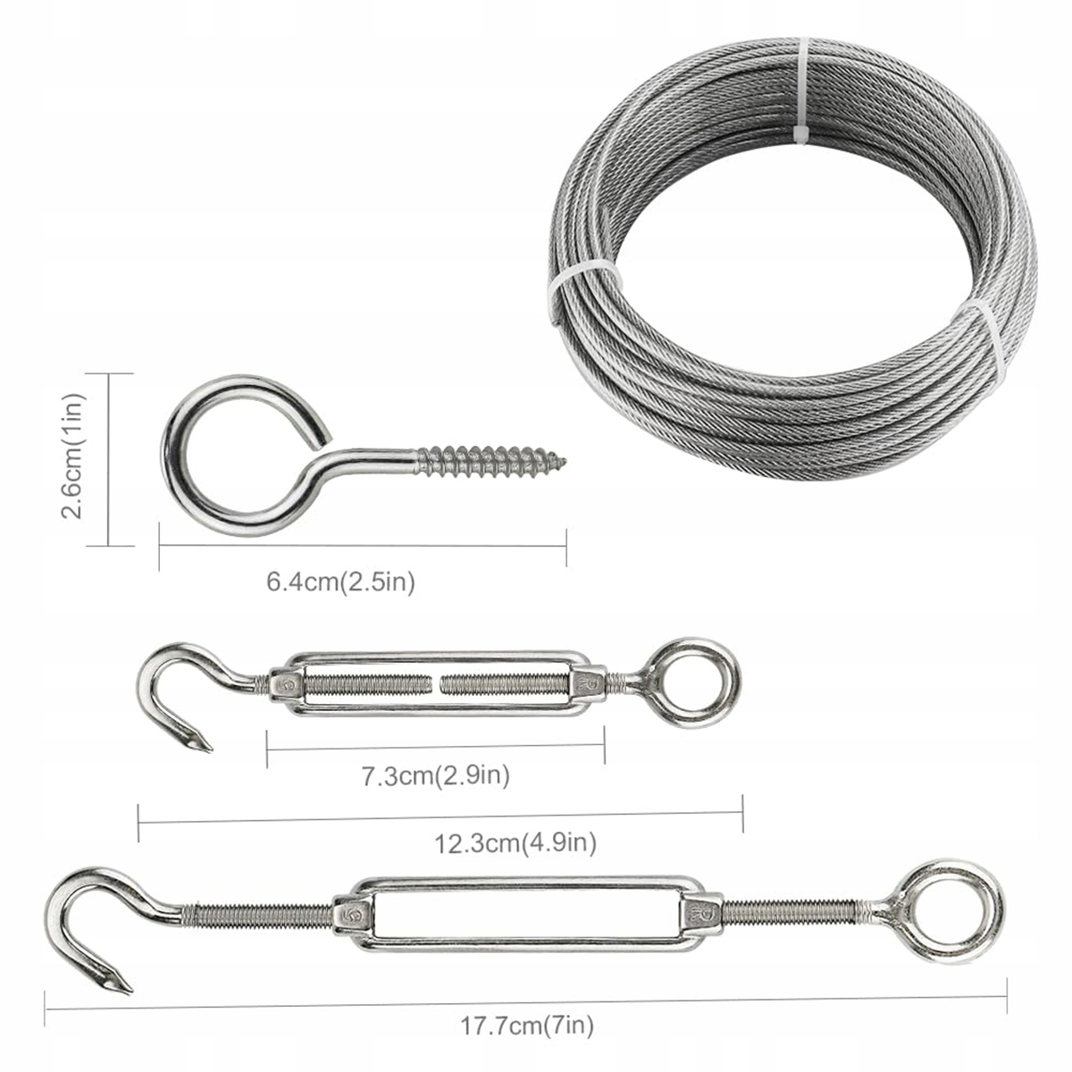 Набор тросов из нержавеющей стали длиной 20 м, ферменный натяжной трос диаметром 3 мм с натяжным крюком из нержавеющей стали M5, рым-болтом/натяжным болтом, рым-болтом, зажимом для троса, алюминиевыми компрессионными зажимами и втулками для троса