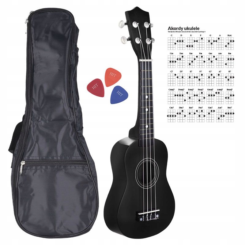 - В комплект входят: гавайская гитара-сопрано, черный футляр, 3 медиатора, аккорды для укулеле.