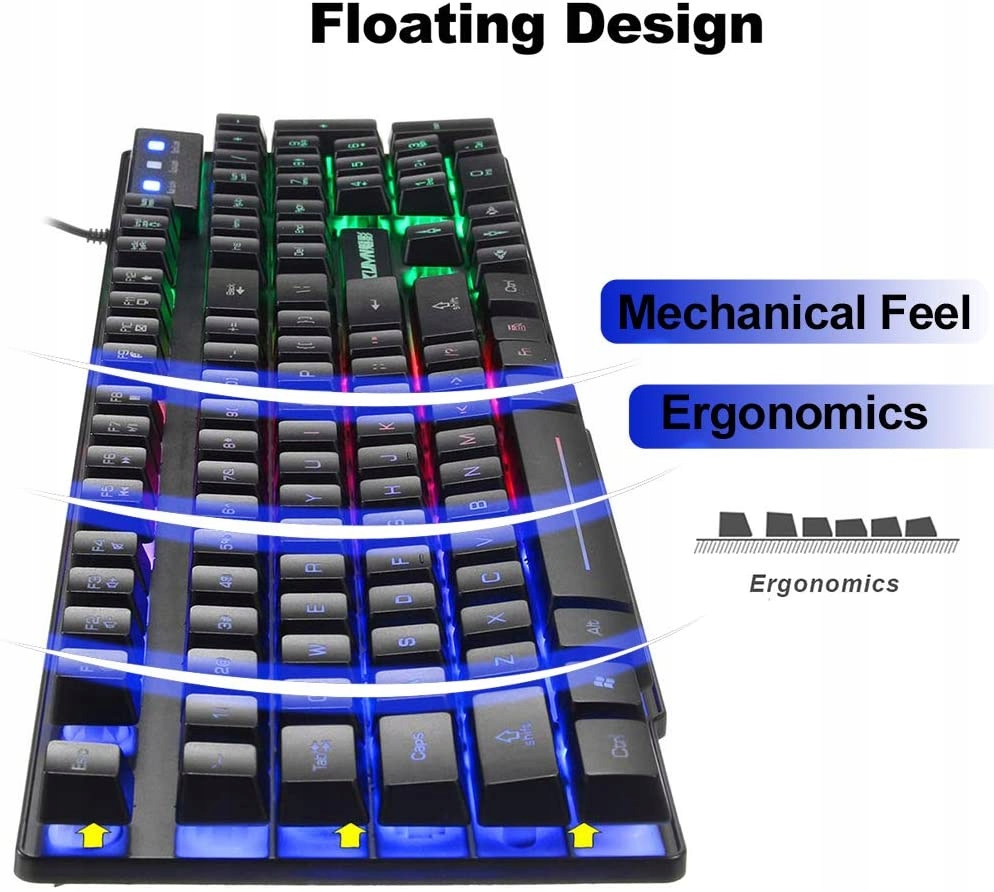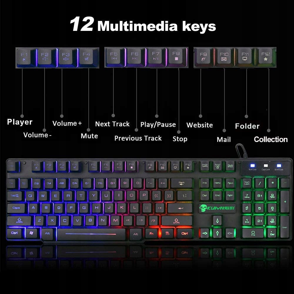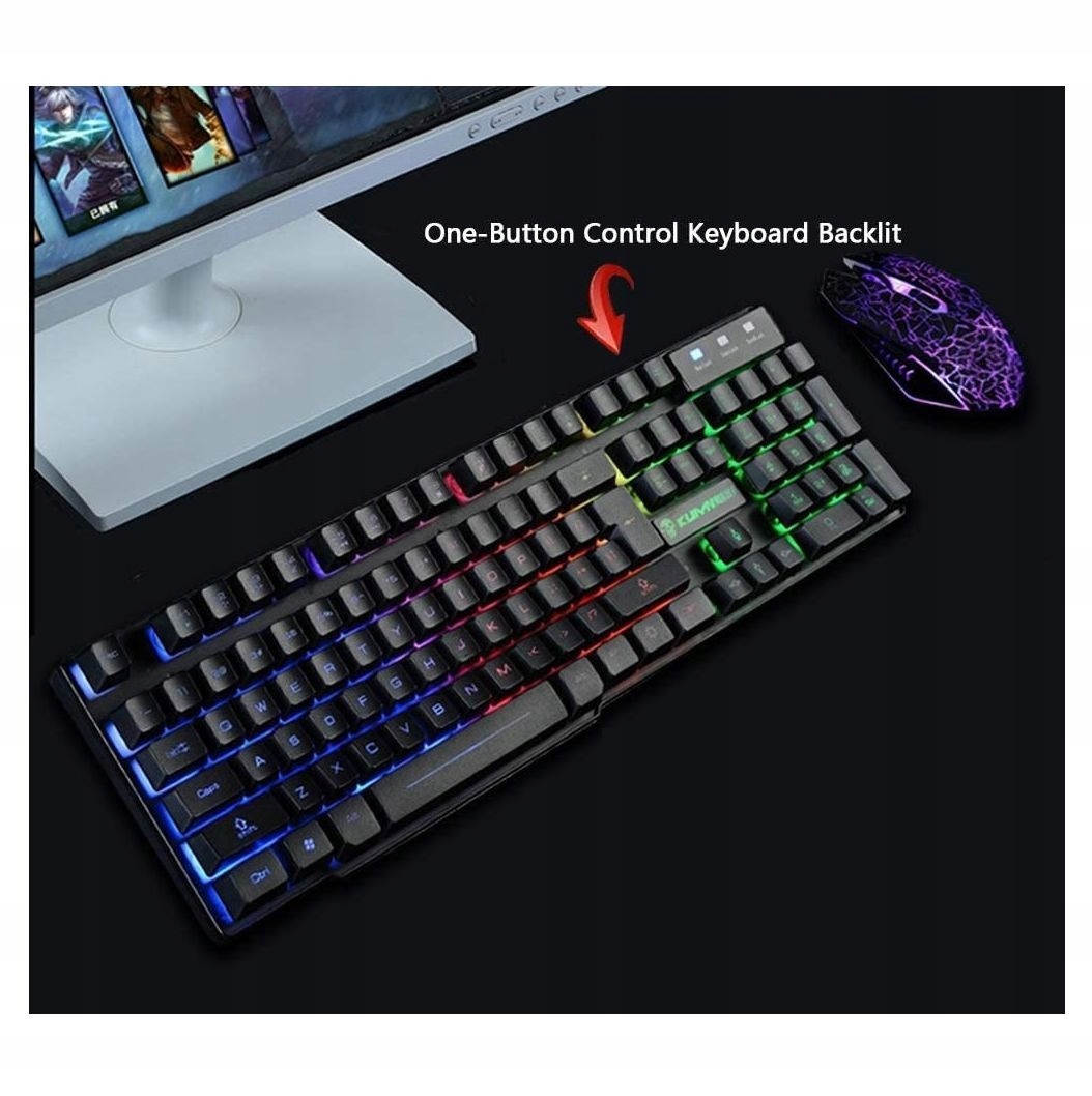 KUIYN T6 Rainbow — игровая клавиатура с RGB-подсветкой. Игровая клавиатура с трехцветной светодиодной подсветкой имеет мягкие на нажатие клавиши, обеспечивающие ощущение комфорта во время каждой интенсивной игровой сессии. QWERTY-раскладка клавиатуры. Мышь с подсветкой и чувствительностью 8000/1600/1600/2400 DPI.