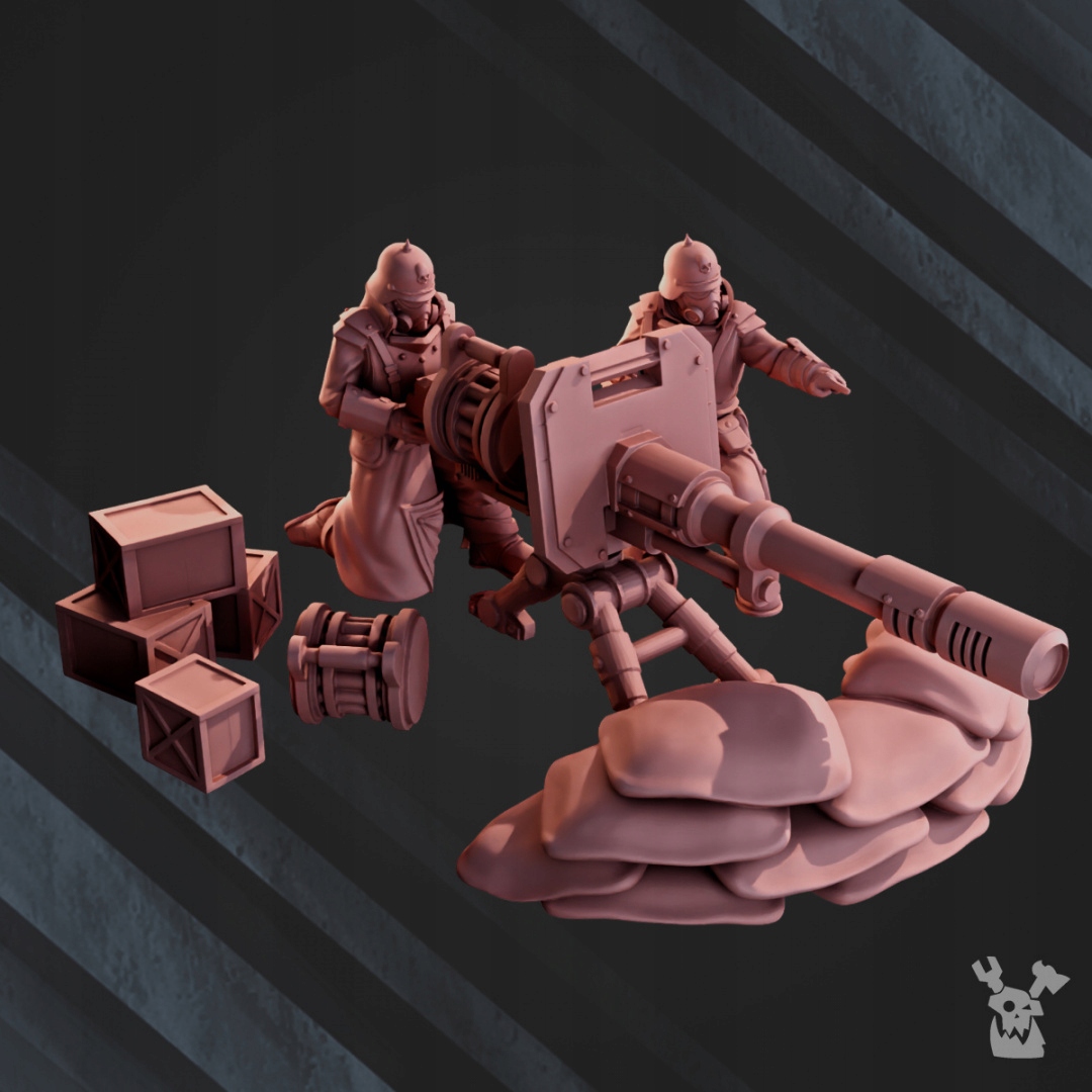 Комплект для самостоятельной сборки. В набор входят две команды по четыре члена экипажа (всего 8 моделей), 5 различных видов оружия и два чехла для мешков с песком.