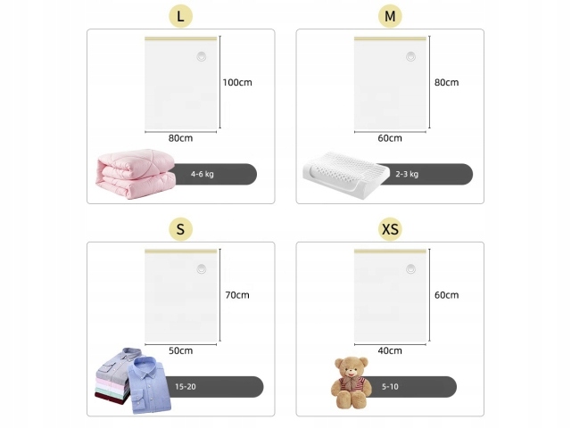 Идеальное решение для всех, кто собирается в отпуск, отпуск и т. д. Благодаря им вместимость багажника увеличивается в три раза. Мы экономим много места в чемодане, сумке или рюкзаке. Сумки изготовлены из прочного ПВХ.