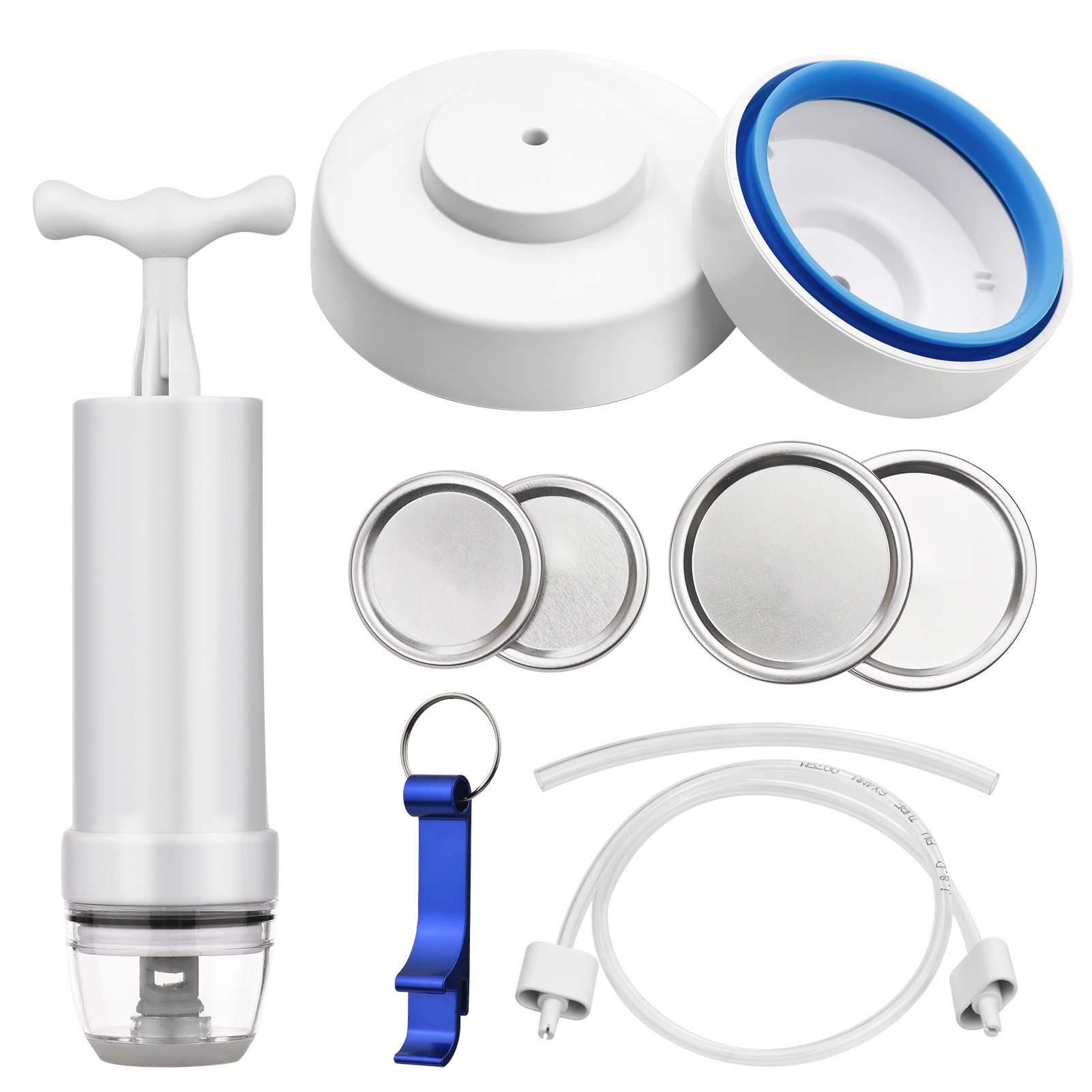 - [Набор вакуумного упаковщика для банок Mason] включает в себя 1 * обычный вакуумный упаковщик для банок, 1 * широкий вакуумный упаковщик для банок, 1 * ручной вакуумный упаковщик, 1 * комплект соединительных шлангов, 1 * переходной шланг, 4 * крышки для банок Mason и 1 * открывалку для бутылок.