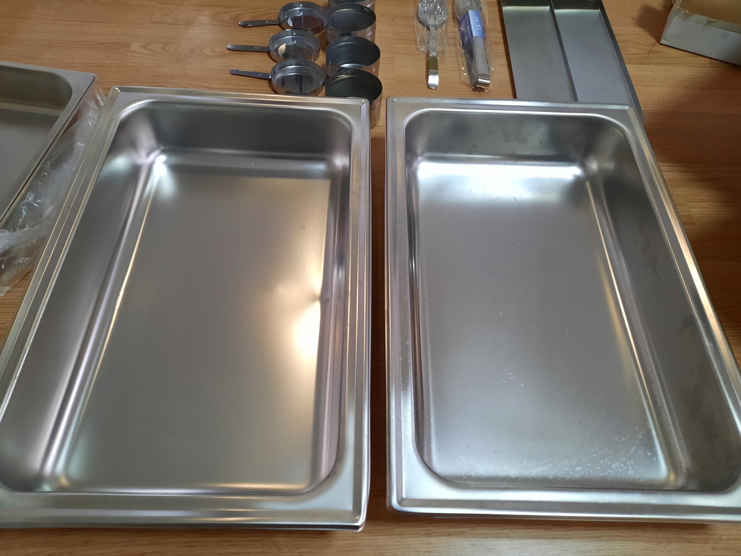 - ПОЛНЫЙ НАБОР АКСЕССУАРОВ. Этот набор для подогрева еды включает в себя 4 держателя для безопасности топлива (топливо не входит в комплект), 2 складные рамы, 2 поддона для воды, 2 средних подноса 8QT, 2 больших поддона, 4 маленьких поддона для еды, 2 крышки с ручками, шумовка и щипцы сервировочный.