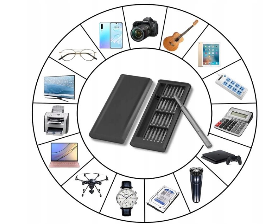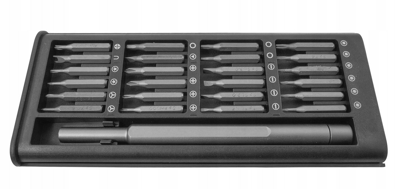 Прецизионная отвертка имеет 24 прецизионных наконечника, предназначенных для часов, фотоаппаратов, радиоприемников, компьютеров, смартфонов, дронов и других обычных домашних устройств. Изготовлен из стали S2.