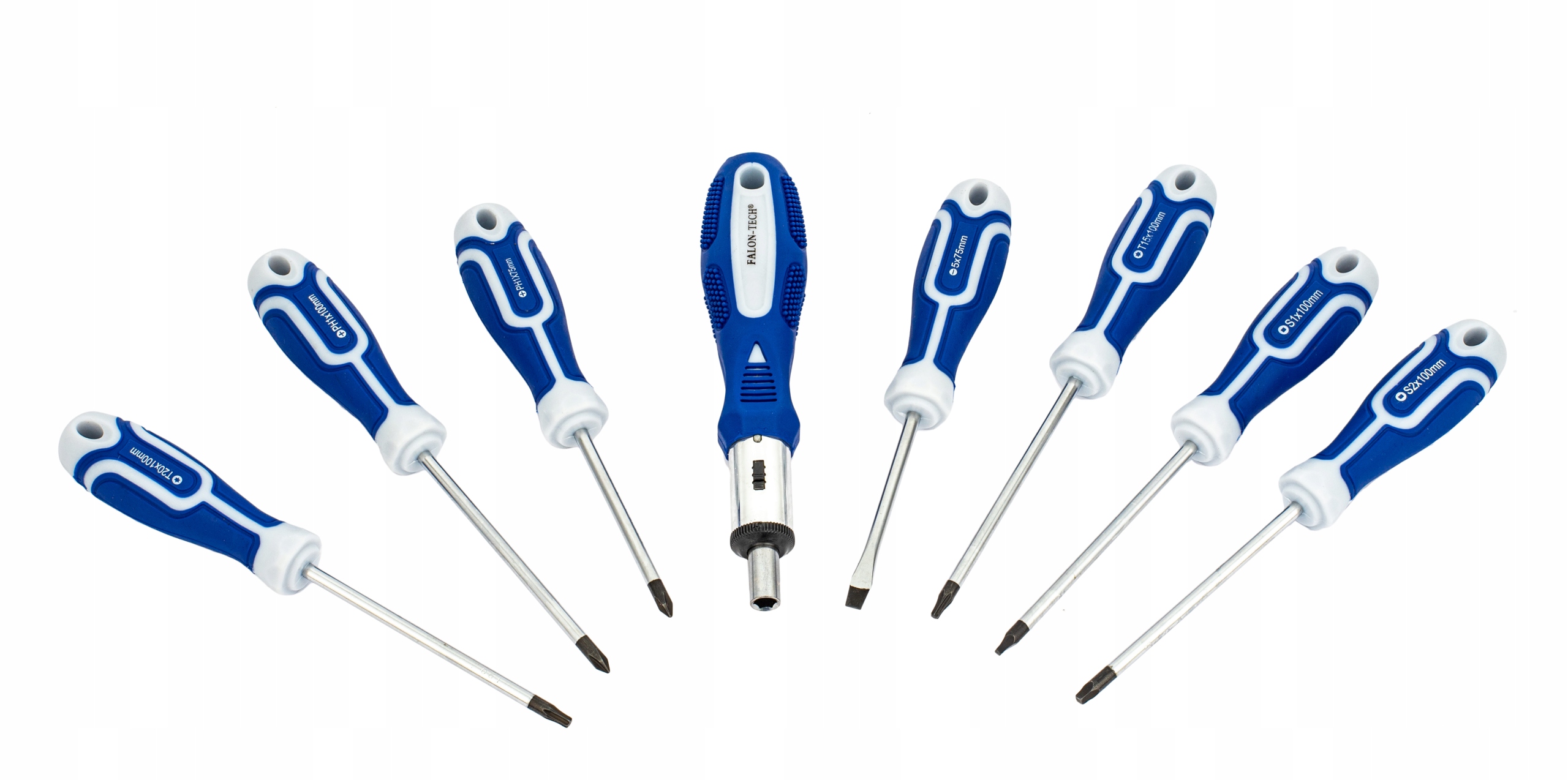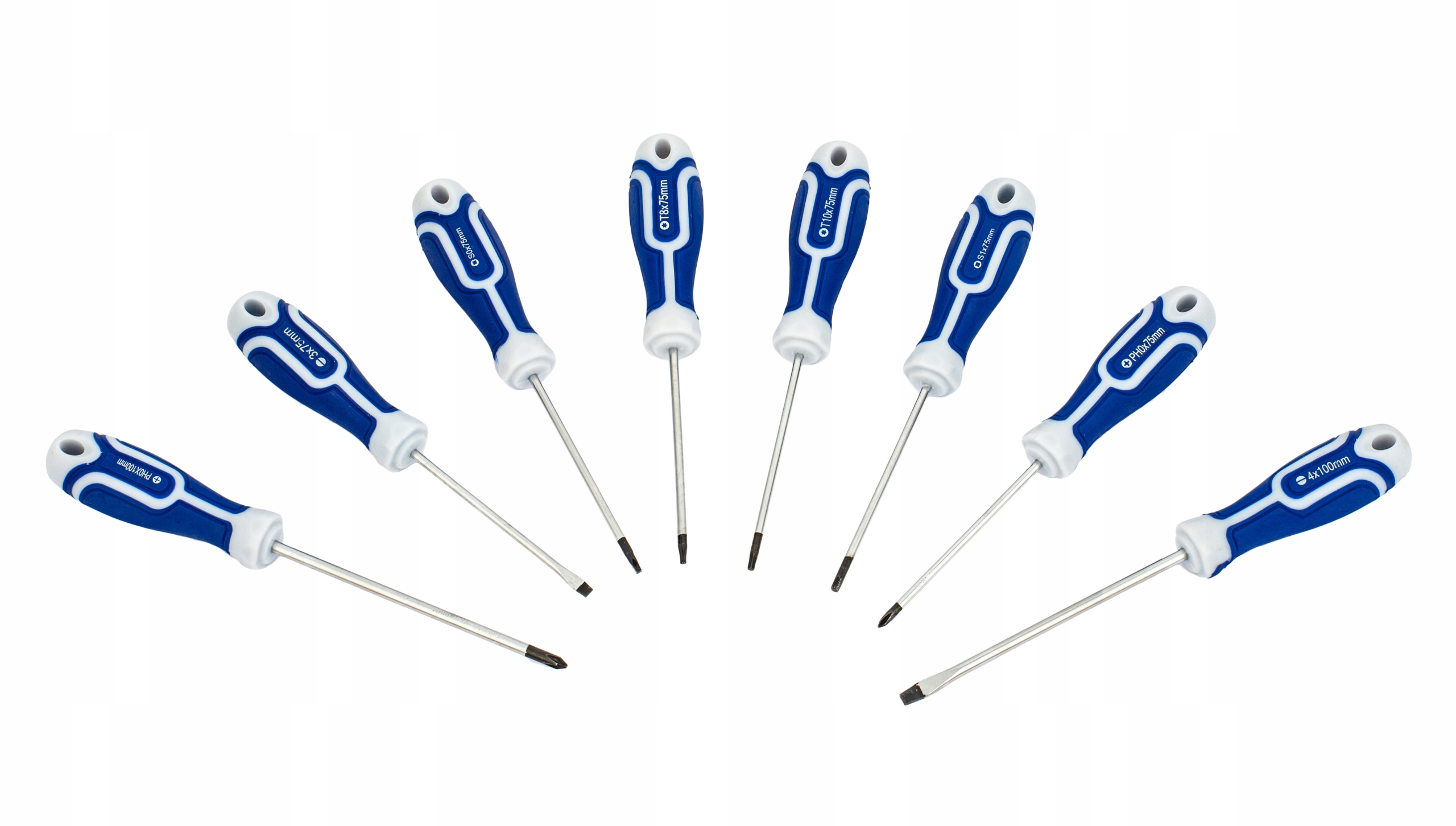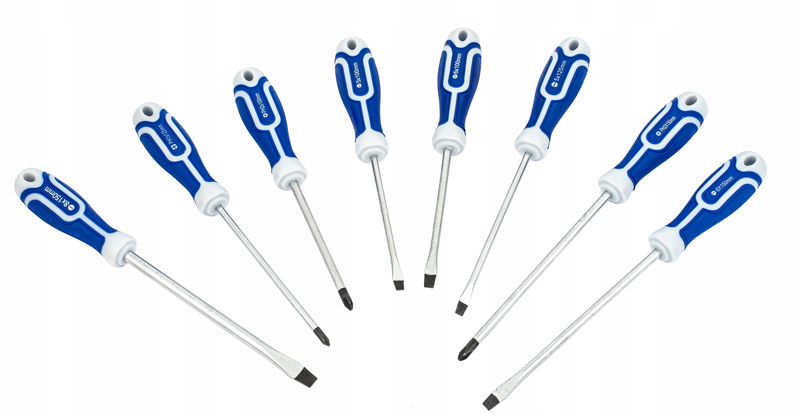 - 8 отверток с плоской головкой: 8x150/6x150/6x100/5x125/5x100/5x75/4x100/3x75 мм