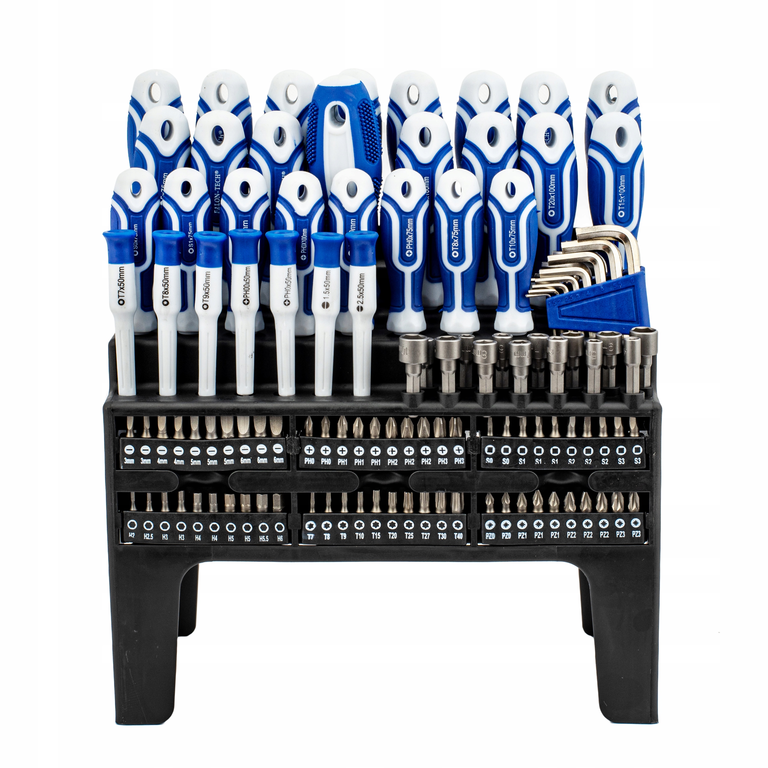 В комплекте Входящая в комплект подставка позволяет легко хранить отвертки. На задней стороне подставки имеются 2 крепежных отверстия, которые позволяют повесить весь комплект на стену.