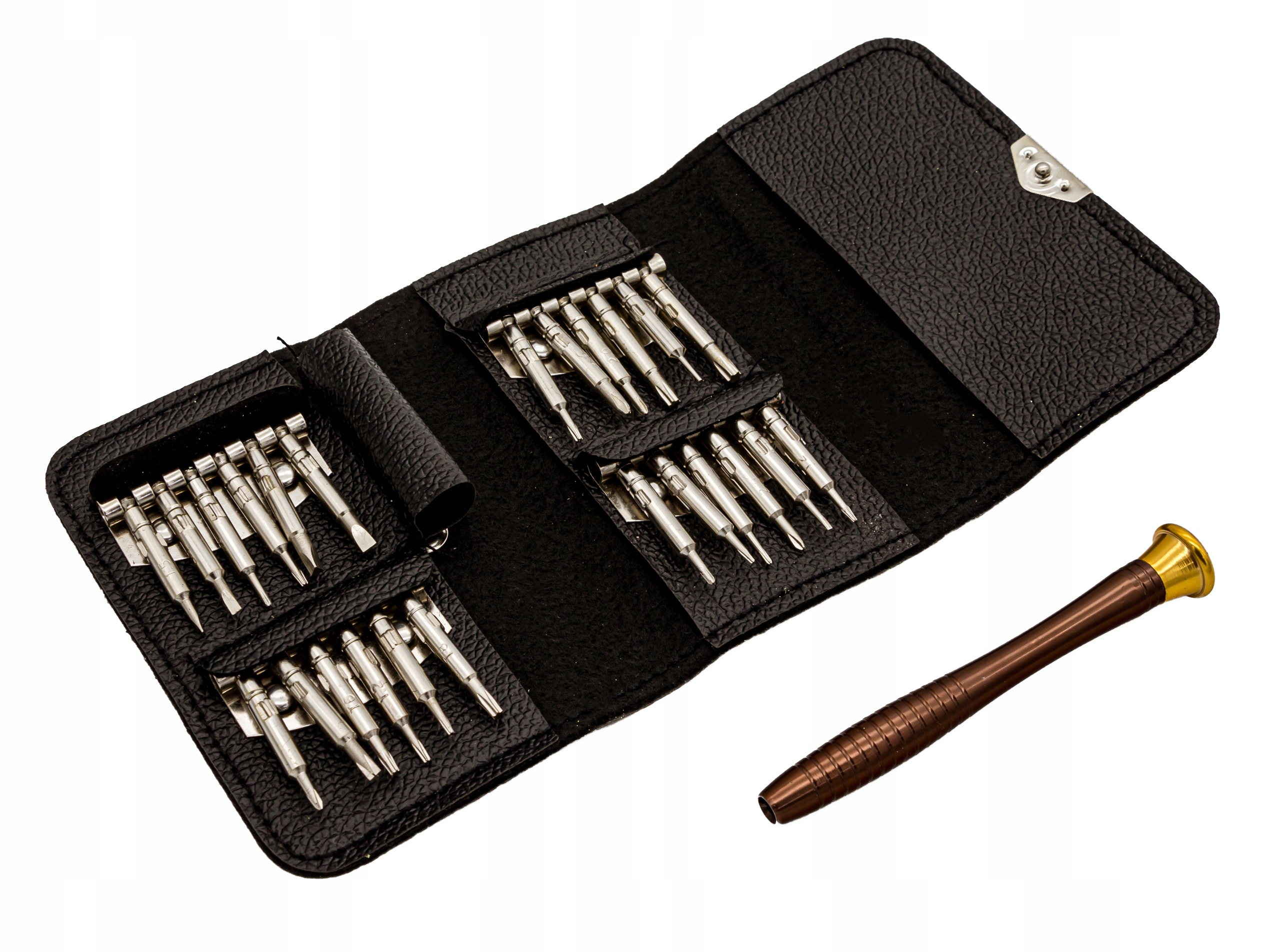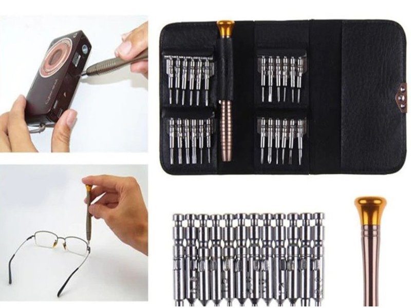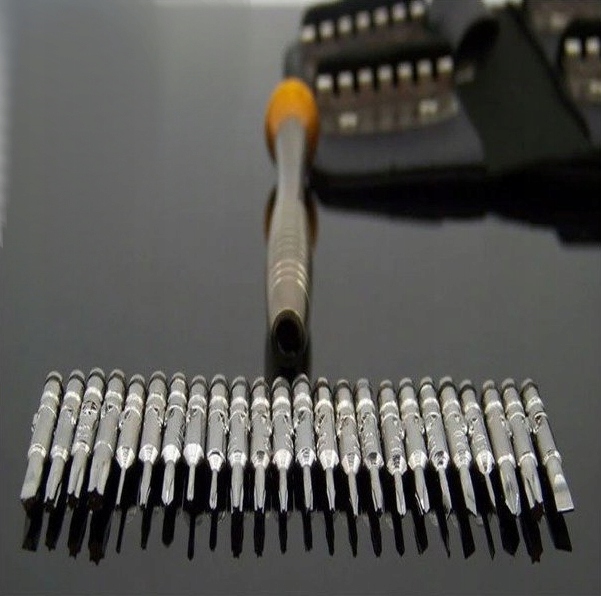 Практичный набор из 24 бит с профессиональной ручкой. Все это дело было закрыто в удобный футляр. Это набор, который мы можем использовать в сервисе или брать с собой в аэропорт, на природу и т. д. Будет полезен при обслуживании смартфонов, ноутбуков, часов и т. д.