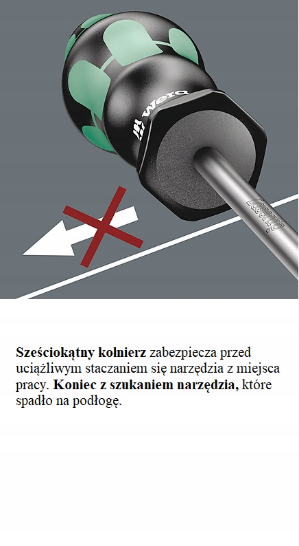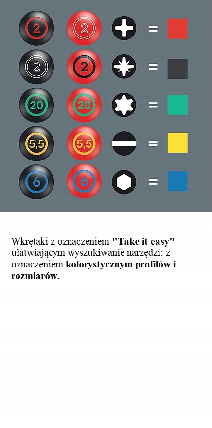 Ручка Kraftform обеспечивает приятную и эргономичную работу, защищая руки от волдырей и мозолей. Жесткие зоны захвата позволяют быстро поворачивать, мягкие зоны захвата обеспечивают передачу высоких крутящих моментов. Некоторые отвертки с наконечником Lasertip: наконечник Lasertip имеет микроскопические канавки, прожженные лазерным лучом, создавая шероховатую поверхность, которая буквально «вгрызается» в гнездо винта. Благодаря этому случайное выскальзывание отвертки становится проблемой. прошлого. Система поиска инструментов «Take it easy» с цветовой маркировкой размеров облегчает и ускоряет поиск нужного инструмента.