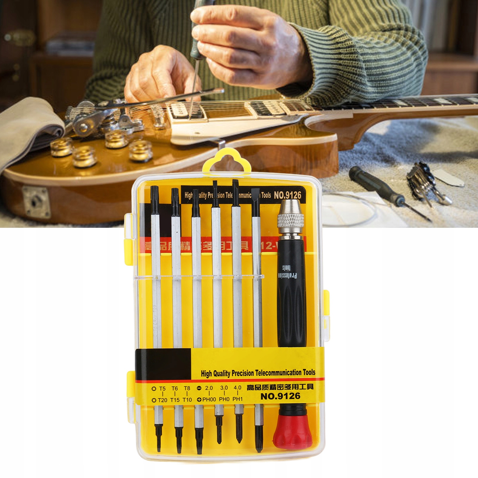 1. СПЕЦИФИКАЦИЯ: Набор отверток для ремонта гитары, включая крестовые, шлицевые и звездообразные типы, различные характеристики для удовлетворения различных потребностей в ремонте.
