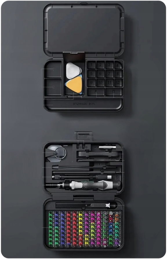 - Использование точных бит и инструментов позволяет легко адаптироваться к специфике каждой задачи, что делает набор универсальным инструментом для любителей DIY, сервисных специалистов и всех, кому нужен полный набор для различных ремонтных и эксплуатационных работ дома, в мастерской или в путешествии.