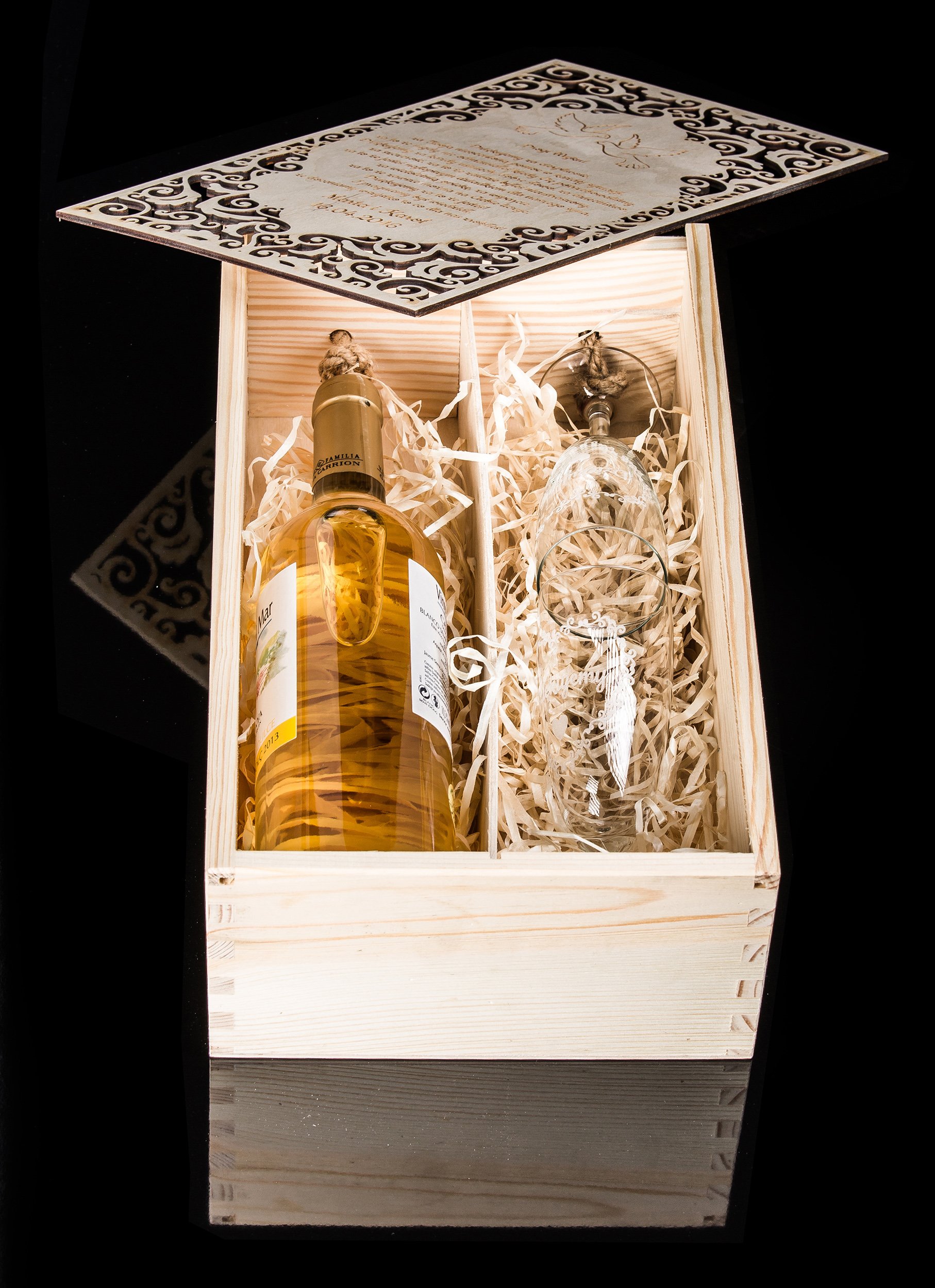 Представляем Вам очки с гравировкой и шкатулку из натурального дерева, вырезанную и персонализированную с помощью лазера. Наш набор с вашим индивидуальным подходом станет прекрасным подарком на свадьбу, благодарственным подарком родителям или любому другому торжеству. Бутылка вина и бокалы прекрасно вписываются в коробку, что делает ее отличным и уникальным подарком.