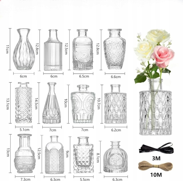 НАБОР ВИНТАЖНЫХ МИНИ-СТЕКЛЯННЫХ ВАЗ 12 ШТ. СВАДЕБНЫЕ УКРАШЕНИЯ В РЕТРО ЦВЕТОЧНЫЕ УКРАШЕНИЯ