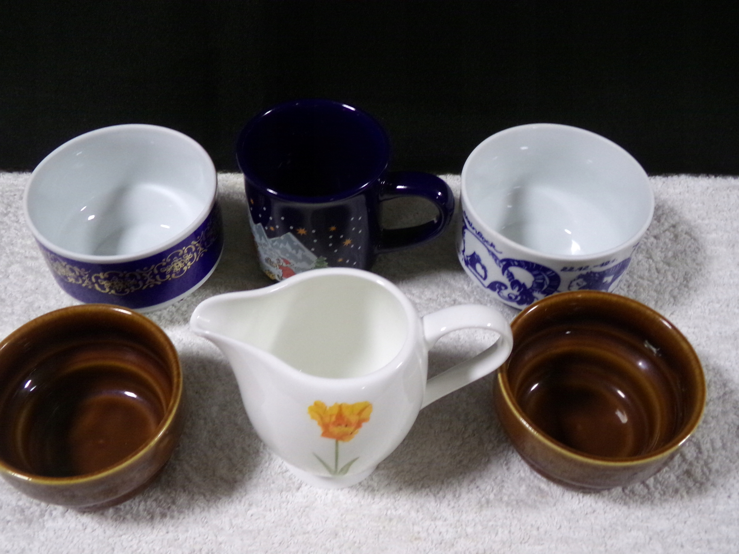 Набор фарфоровых и керамических изделий диаметром от 9 до 12 см, высотой от 5,5 до 10 см, весом 1,20 кг. В очень хорошем состоянии, без повреждений.