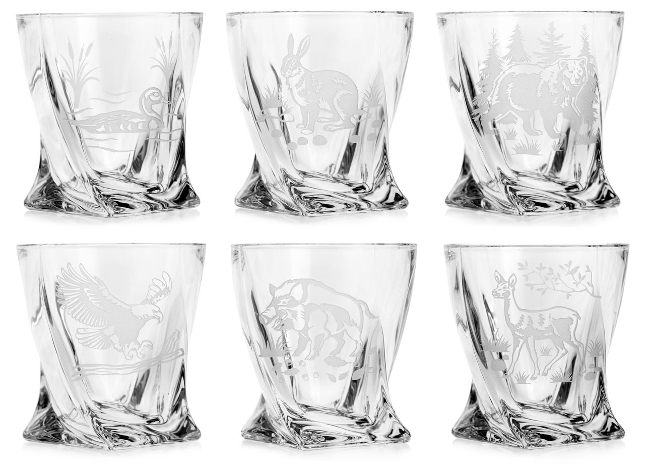 Эксклюзивный набор для виски CRYSTAL: 6 стаканов по 340 мл + графин 850 мл с гравировкой охотничьих мотивов