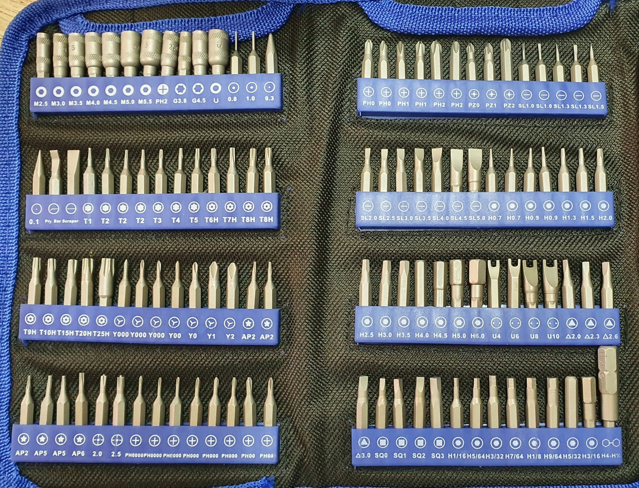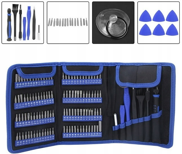 Прецизионный ремонтный комплект, состоящий из отвертки и бит из стали CRV, твердость может достигать 50-54HRC, устойчивы к ржавчине и выдерживают более высокие нагрузки. Дополнительно инструменты для ухода, чехол с отдельными секциями, застегивающимися на липучки.