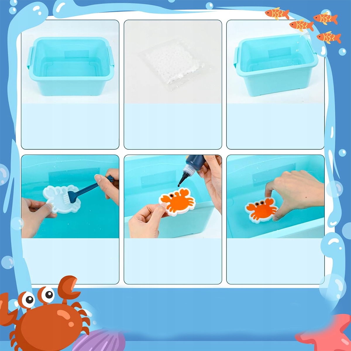 Это водное животное, сделанное своими руками из волшебного геля, легко и весело. Просто выдавите волшебный гель в форму, подождите 30 секунд, поместите его в воду и медленно встряхивайте форму, пока гель не вытечет. Затем поместите его обратно в воду и подождите более 30 минут, пока гель затвердеет.