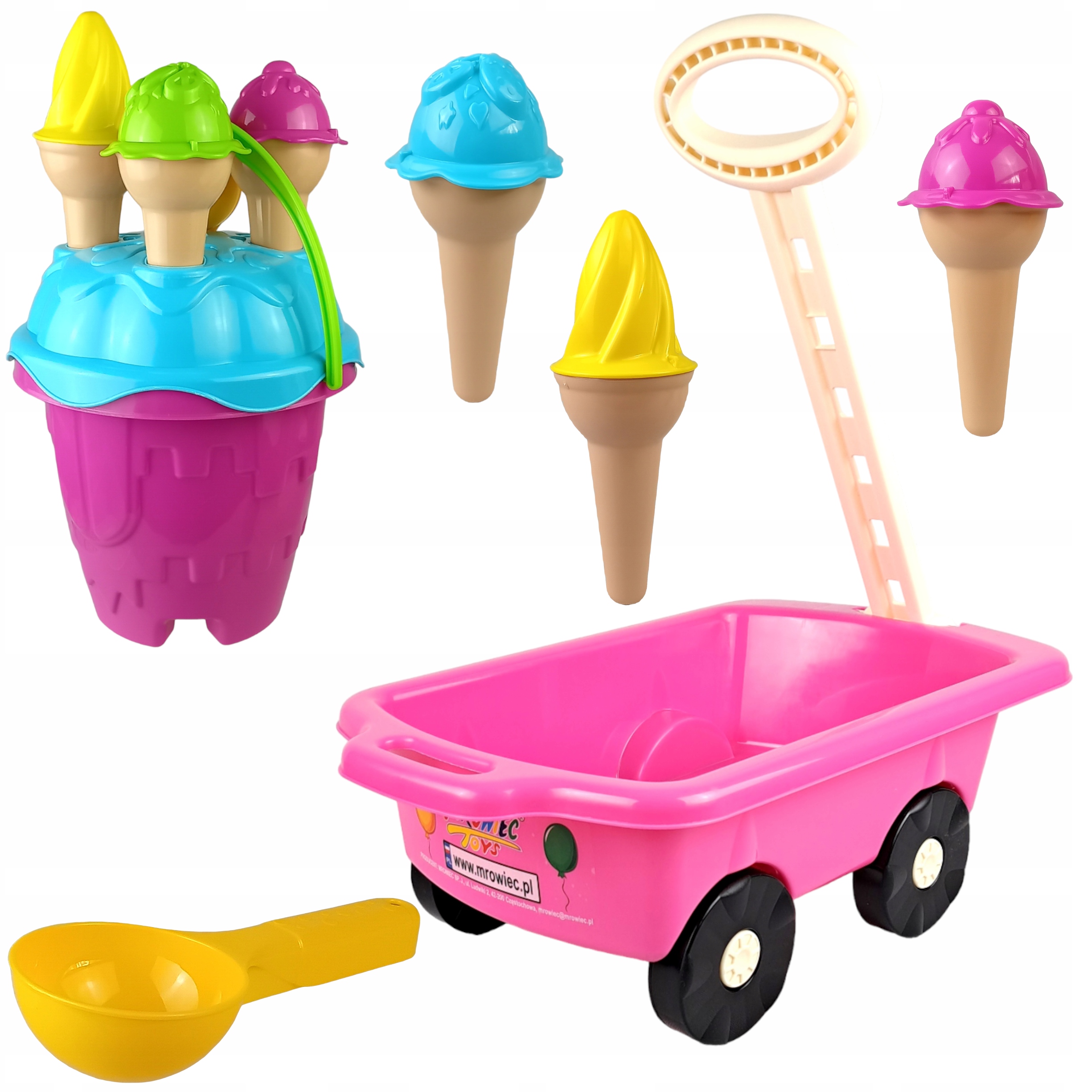 ОТЛИЧНЫЙ НАБОР ДЛЯ ИГР НА ДАЛЕ — РОЗОВАЯ КОЛЯСКА С РУЧКОЙ И ФОРМАМИ ДЛЯ МОРОЖЕНОГО