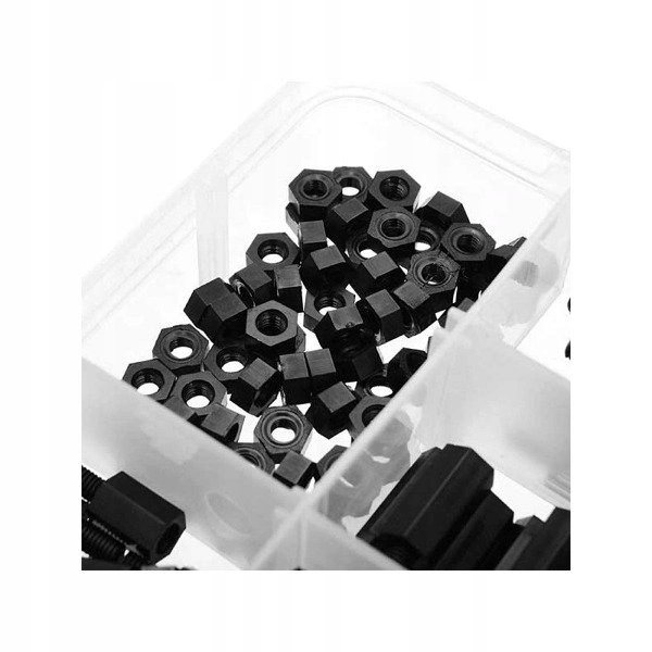 Набор из 180 винтов и рукавов расстояния различных размеров, изготовленных из полиамидного материала. Полиамид является более сложным и более сложным материалом, чем полиэфир (например, из полиамидов создается материал, из которого создаются пластиковые бутылки). Этот материал очень часто используется для производства передач, где материал должен быть устойчив к нагрузке.