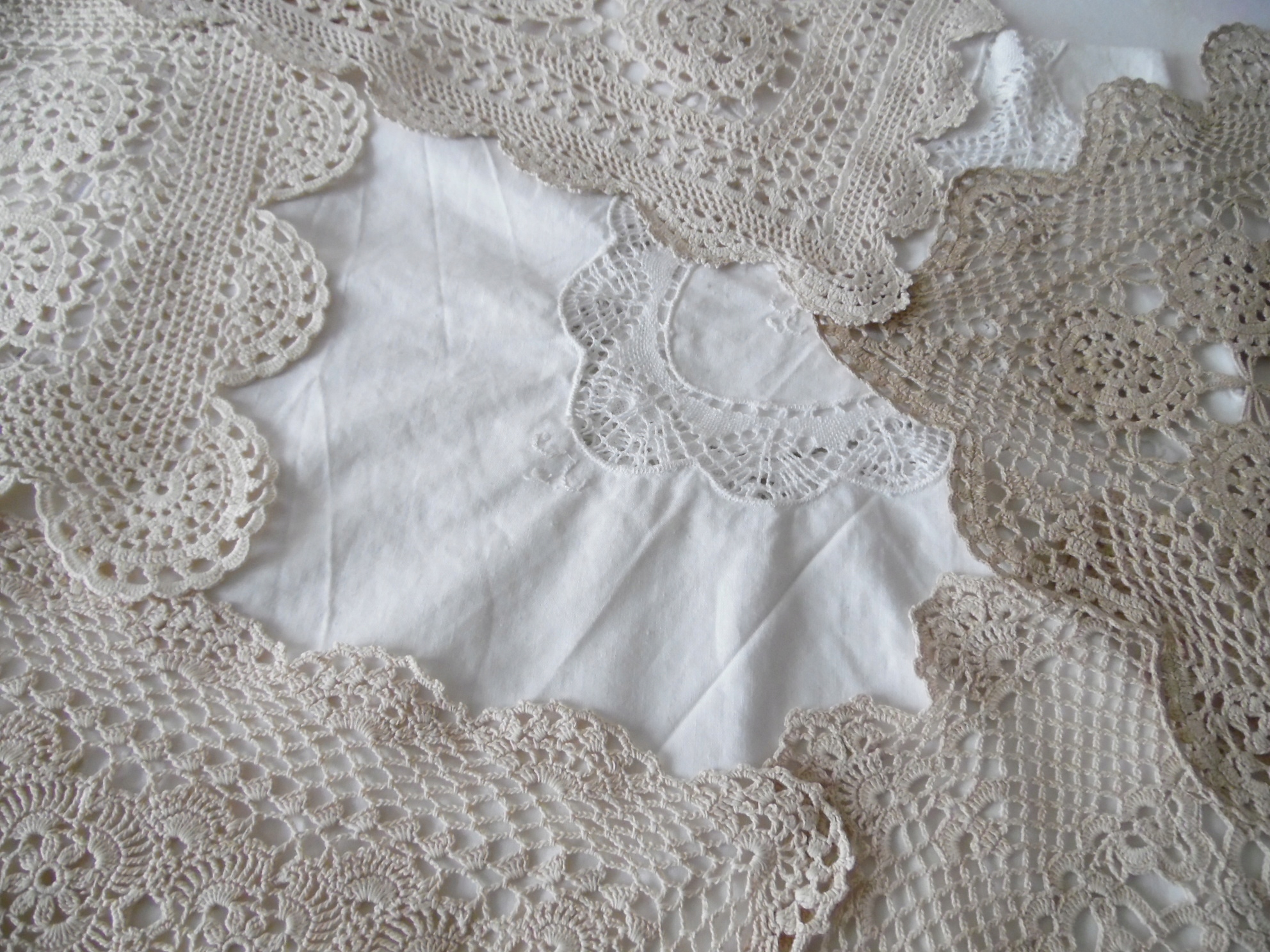 Набор кружевных салфеток, связанных вручную крючком из хлопковых ниток, различных оттенков бежевого цвета. Размер: от 26х42 до 32х50 см, 5 шт