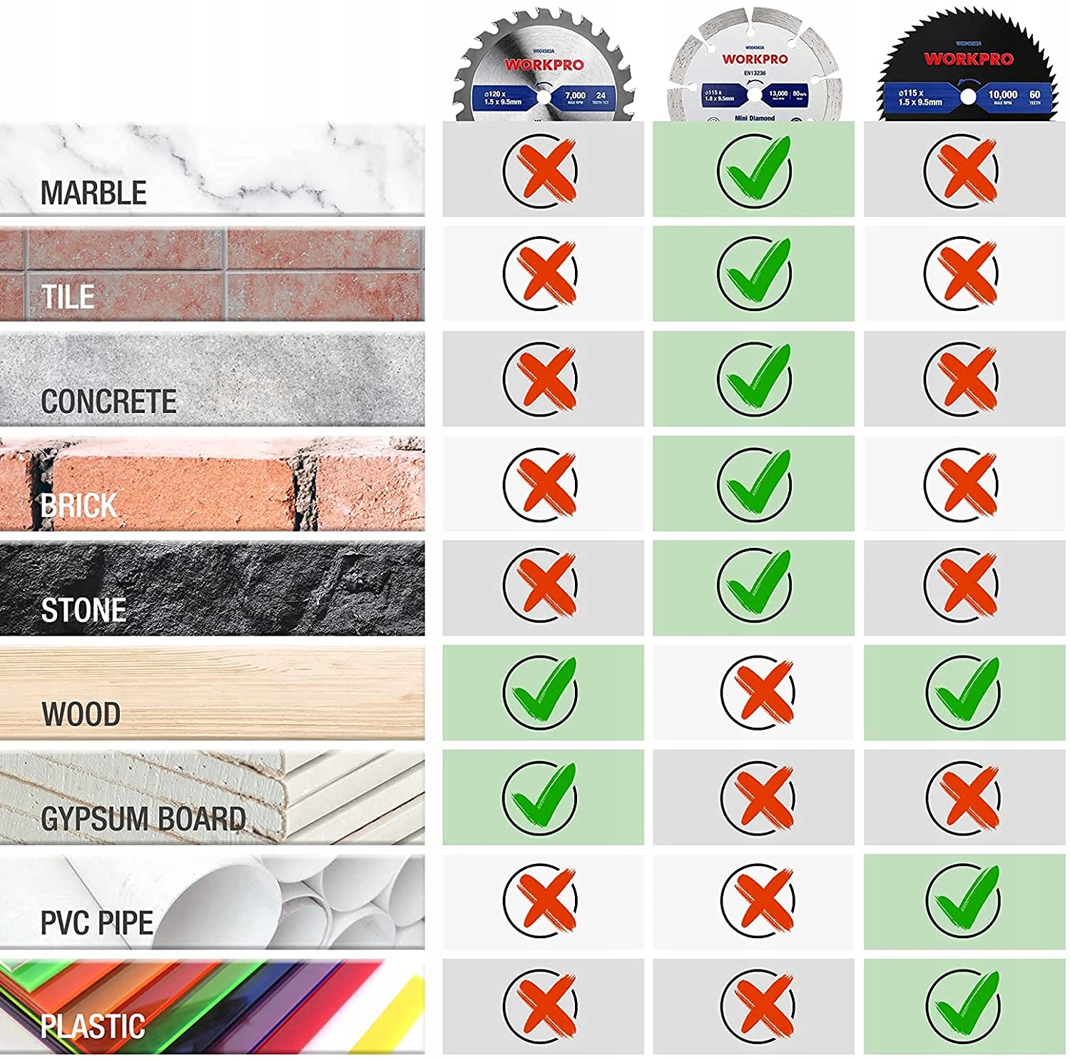 Набор WORKPRO из 3 мини-циркулярных пил, включая алмазные диски диаметром 115 мм, полотна для дерева TCT 120 мм и полотна для дерева/пластика 115 мм