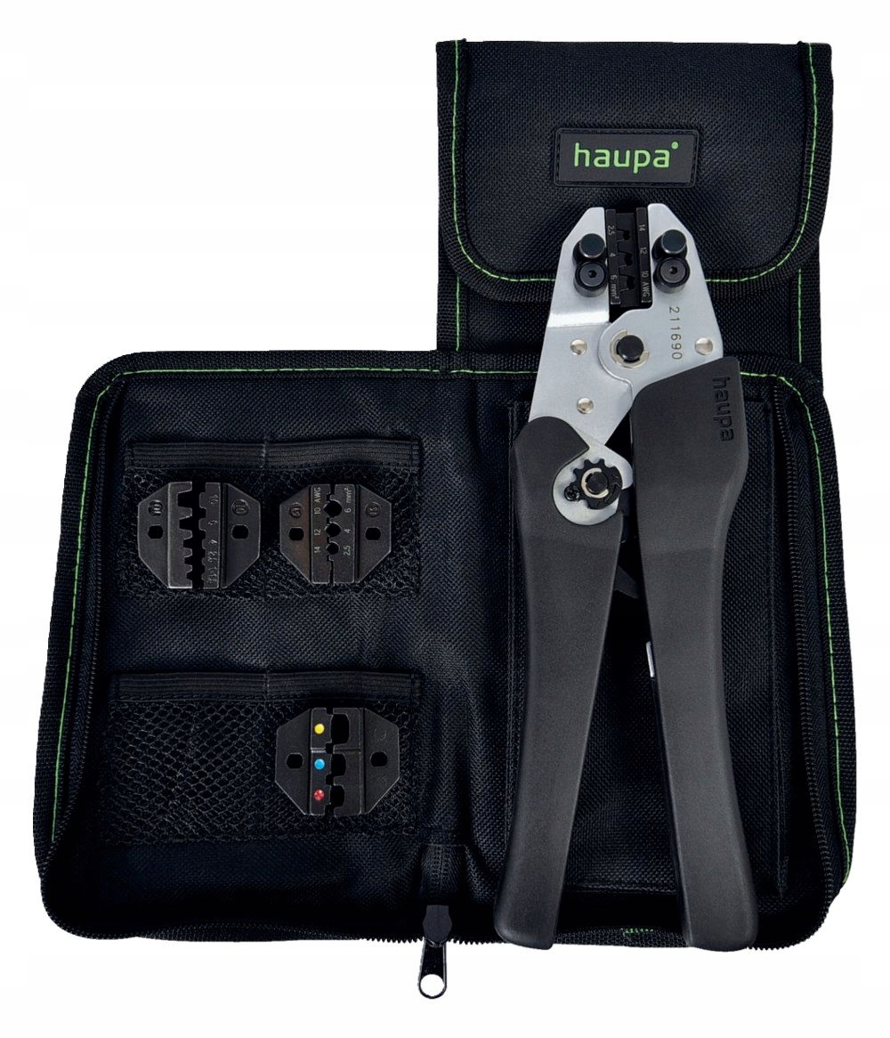 Обжимные клещи для быстрой замены прецизионных пресс-вставок HAUPA. Особенно для фотовольтаики. Поставляется в прочном нейлоновом чехле, арт. 220260. В комплекте: Арт. 211690 Арт. 211657E Арт. 211659Е Арт. 210842Е Арт. 210761E