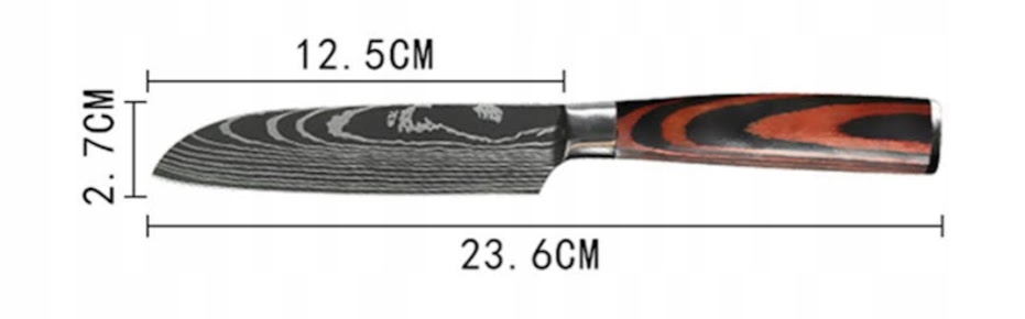 - Нож сантоку (23,5 см) - японский аналог поварского ножа, идеально подходит для разделки, шинковки и нарезки ломтиками.