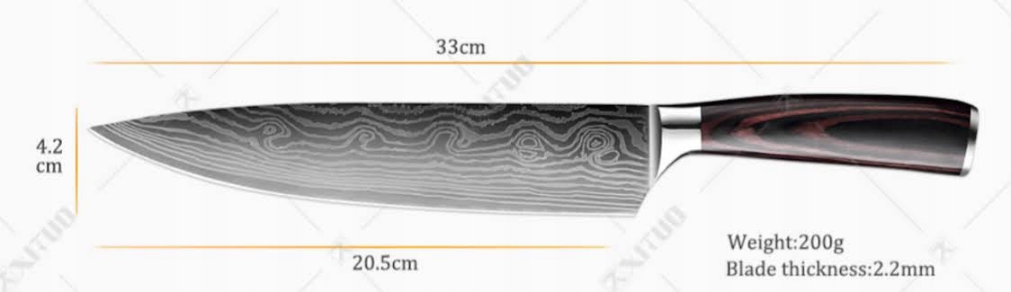 - Нож шеф-повара (33,5 см) — базовый кухонный инструмент, идеально подходящий для измельчения многих ингредиентов.