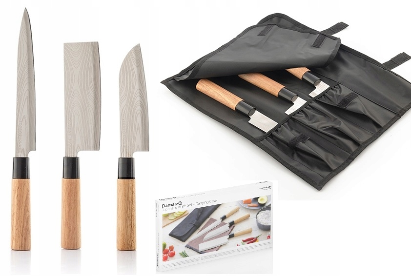 Полный набор высококлассных японских ножей с профессиональным кейсом и клинками в дамасском стиле с собственным дизайном декора (лазерная гравировка). В комплекте 3 типа ножей: филетировочный (для рыбы), топор (для нарезки овощей) и сантоку (для нарезки кубиками овощей, мяса или рыбы). Идеально подойдет в качестве подарка, подойдет для самой изысканной кухни и оправдает ожидания лучших поваров.