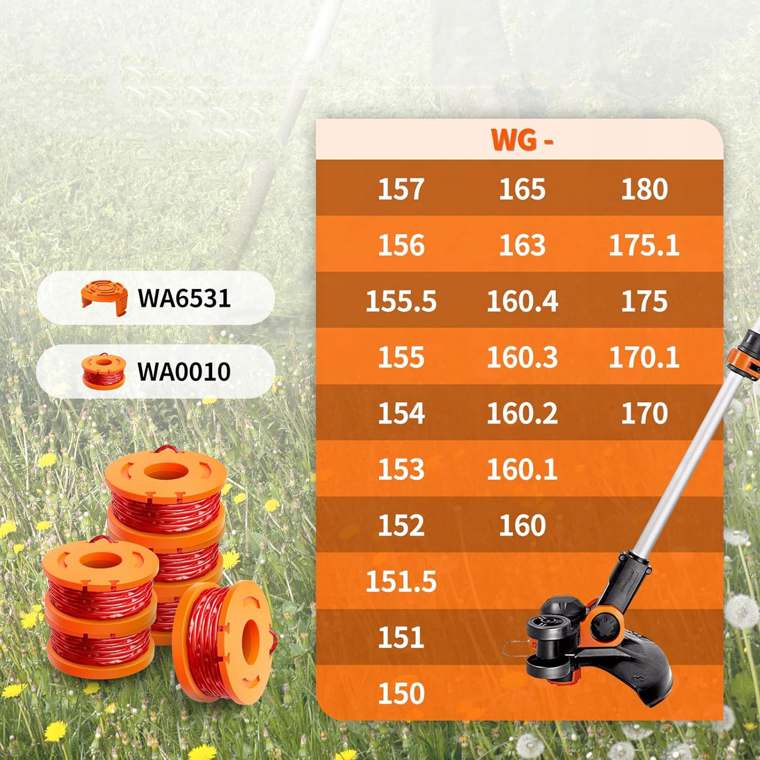 Подходит для широкого спектра моделей триммеров WORX: WG150, WG151, WG151.5, WG152, WG153, WG154, WG155, WG155.5, WG156, WG157, WG160, WG160.1, WG160.2, WG163, WG165, WG175, WG180.