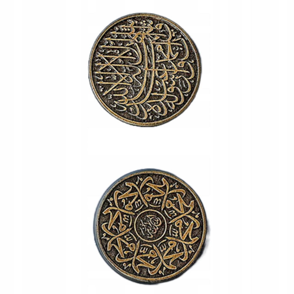 изготовлен из цинковых сплавов, набор из 12 замечательных тяжелых монет, которые были украшены мотивами, указывающими на ближневосточное происхождение. «Бог велик, чье имя не должно быть объявлено невероятном, и его пророк великолепен. Он дал нам гигиену, он научил нас мыть части своего лица и рук три раза. Он позволил нам обнаружить медицину, что мы поделились хирургическими и травяными знаниями со всеми кланами. На следующих поколениях. Текст нанес на могилы, которые были в профилам, не были в профиляциях по профилям. Направлено