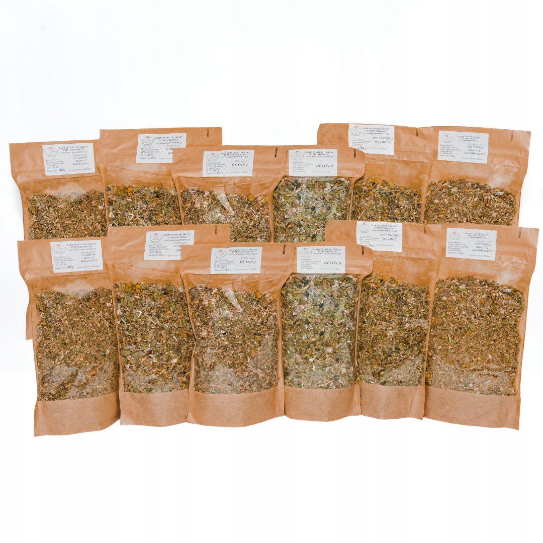 Корень: Dandelion, Wilżyna; Лист: черная сморона крапива; Трава: три -цветоребленная фиолетовая, ясность, Норвегия, одуванчик, овощные осторожные, птичий узел, хвост; РИЗОМ: Пирз; Розовая дикая шкала; Цветок: Акация, ромашка.