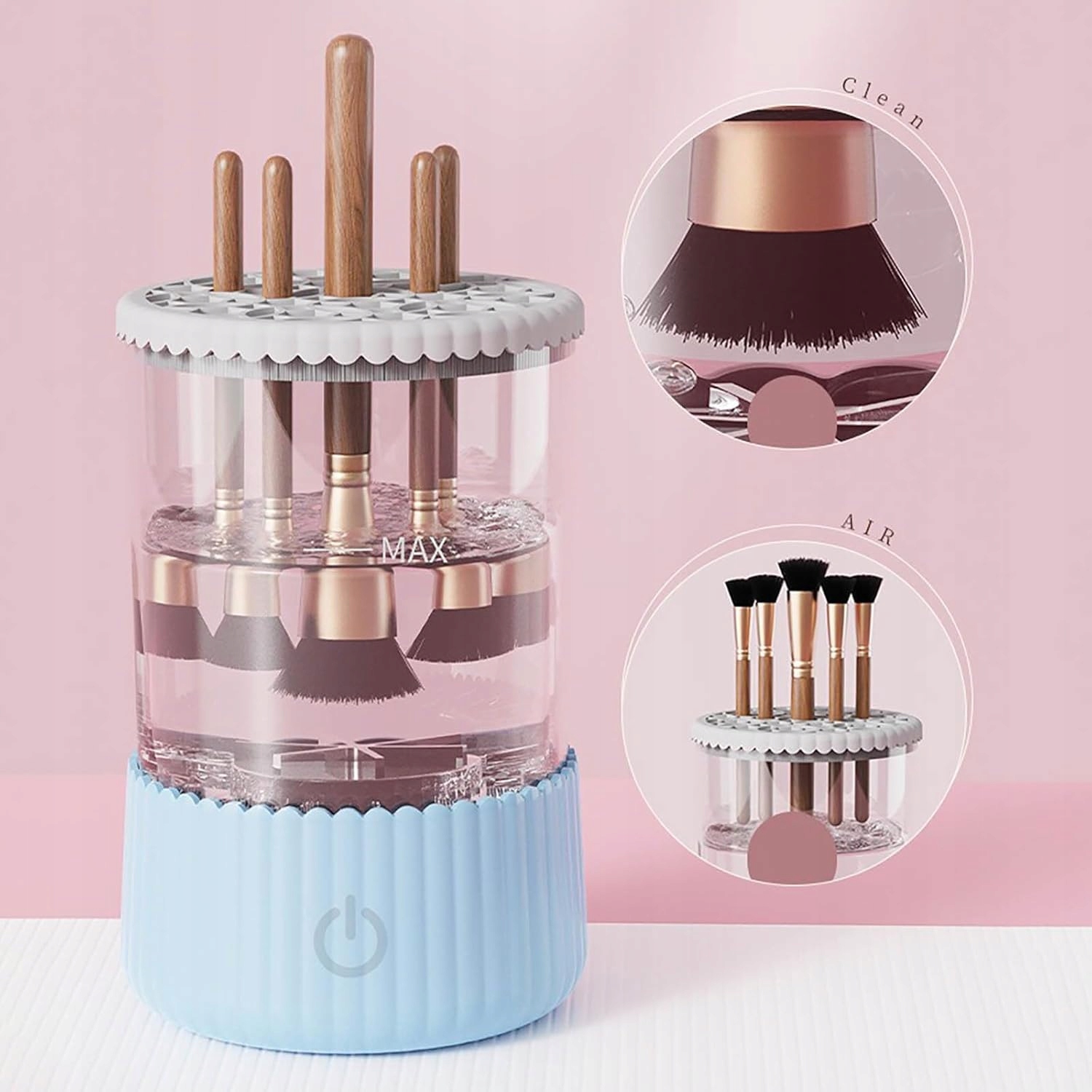 - Автоматическая очистка: Автоматический цикл очистки с использованием вращательных движений, обеспечивающий тщательную очистку нескольких щеток одновременно. Просто наполните резервуар водой, поместите кисти в силиконовые крючки и включите устройство.
