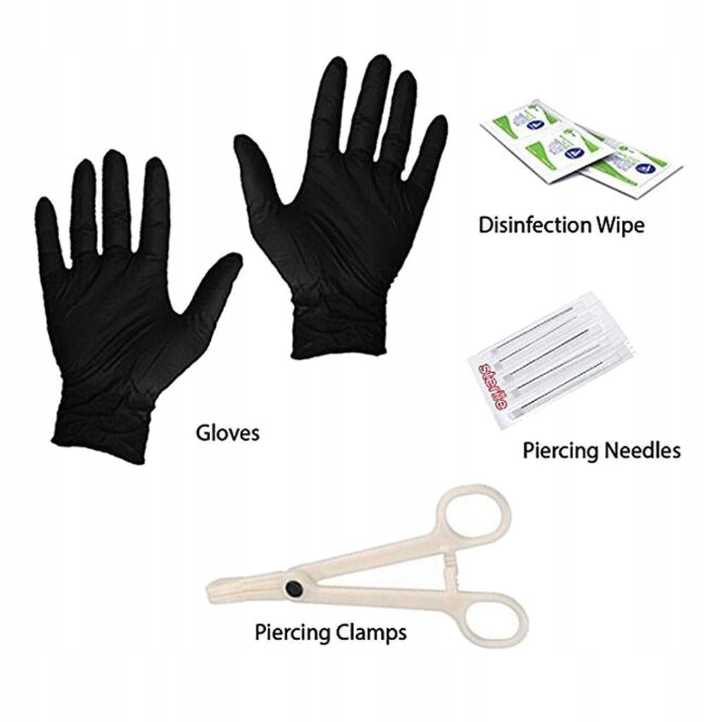 В КОМПЛЕКТ ВХОДЯТ: 5 игл для пирсинга (14G), одноразовые зажимы для пирсинга, пара черных латексных перчаток, спиртовые салфетки и 5 колец диаметра из деталей CZ