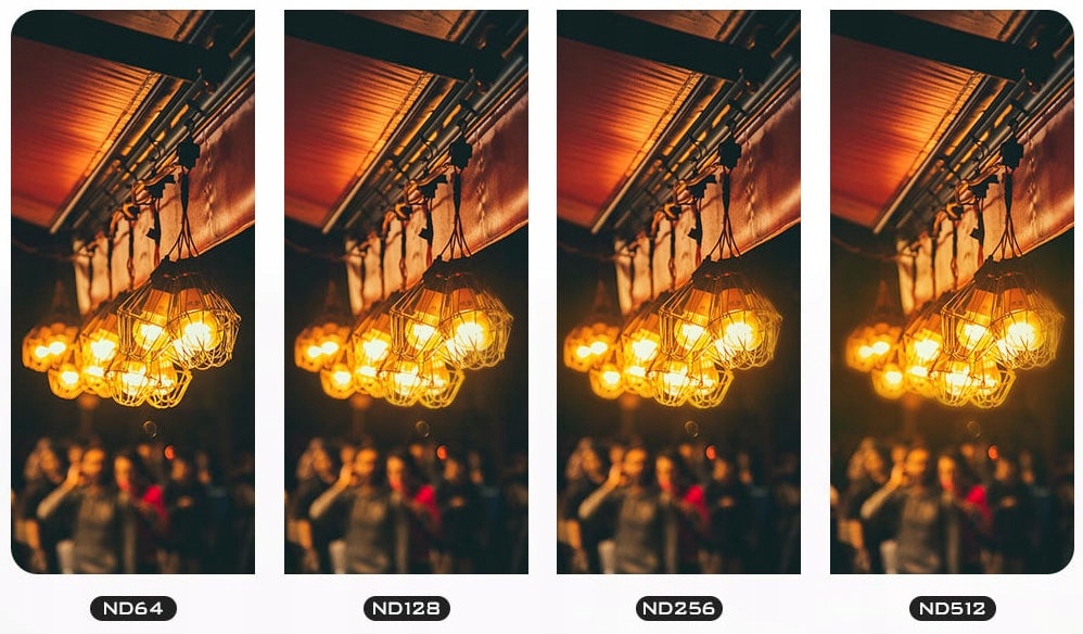 В комплект входят фильтры ND4x - ND32x (ND0,6 - ND1,5) и ND64x - ND512x (ND1,8 - ND2,7), использование которых соответствует уменьшению количества света, попадающего на датчик. на 2–5 или соответственно от 6 до 9 делений диафрагмы.