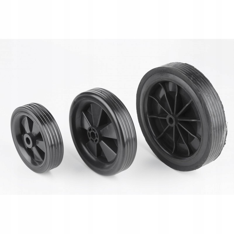 Комплект универсальных колес диаметром 190 мм, предназначенных для компрессоров, продается в том числе и в нашем магазине, но их можно успешно использовать и со многими другими, имеющимися на рынке. Колеса изготовлены из прочного и устойчивого к повреждениям пластика и закаленной резины.