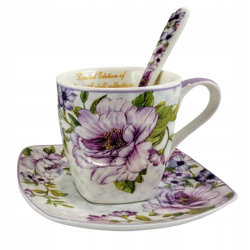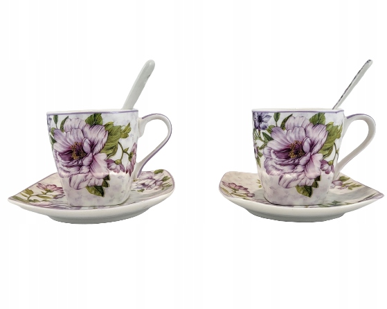 Набор включает в себя: 2 чашки (80 мл), 2 тарелки, 2 чайные ложки