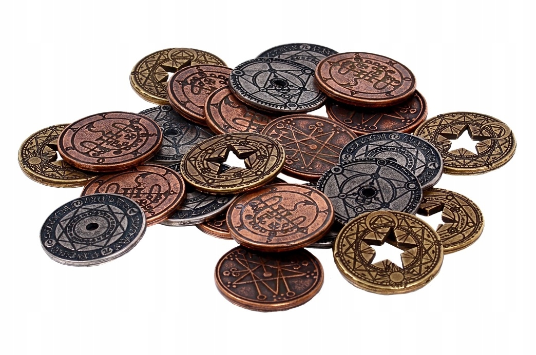 Набор из 20 монет из цинковых сплавов, вдохновленных магическими кругами, печатями и заклинаниями. Монеты, отчеканенные алхимиками из Башен Магов по рецепту Филиппа Ауреола Теофрата Бомбаста фон Гогенгейма (пожалуйста, не заставляйте меня повторять этот список имен еще раз, ведь все знают его под другим именем - Парацельс). Деньги изготовлены из тщательно отобранных материалов, обладающих необузданной магией. Оснащен изоляторами от конденсата – безопасно для новичков благодаря сертификату Sędziwoj в Кракове. Кроме того, на их спине имеются полезные магические круги, которые не только служат шпаргалкой для рисунков на полу вашего темного особняка, но также служат активными мобильными мини-кругами силы. Все, что нужно, — это немного каталитического заклинания и положить монету в карман вашего смертельного врага, и через некоторое время вы обнаружите останки этого врага, разбросанные по полу. Красивая месть, не так ли? Да, с их помощью можно призывать драконов... ладно, дракончиков. Подходит для кругов небольшого размера, отштампованных на медных дисках. Мы не несем ответственности за возможные пожары.