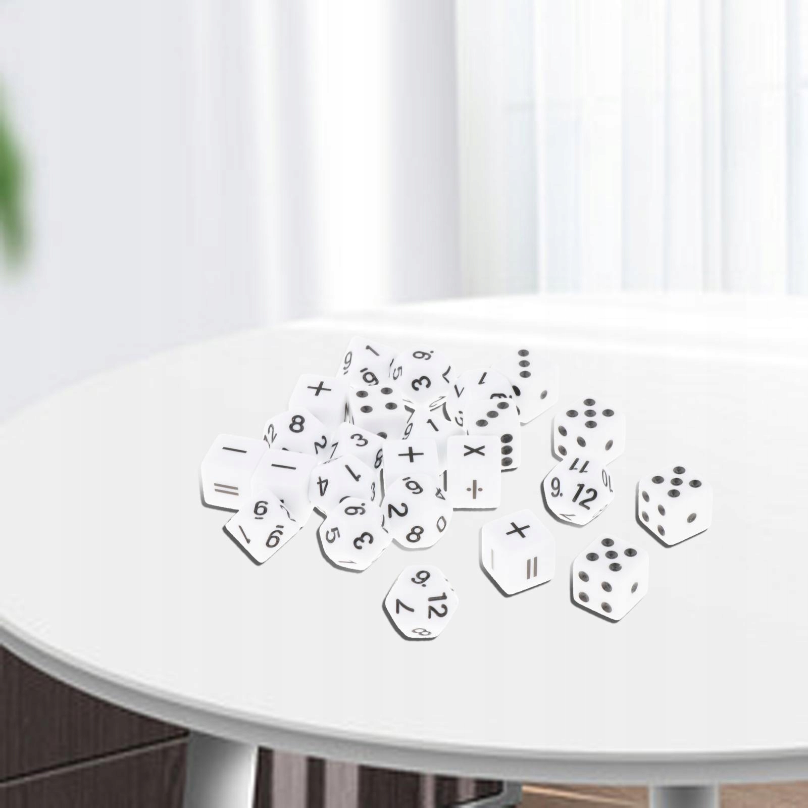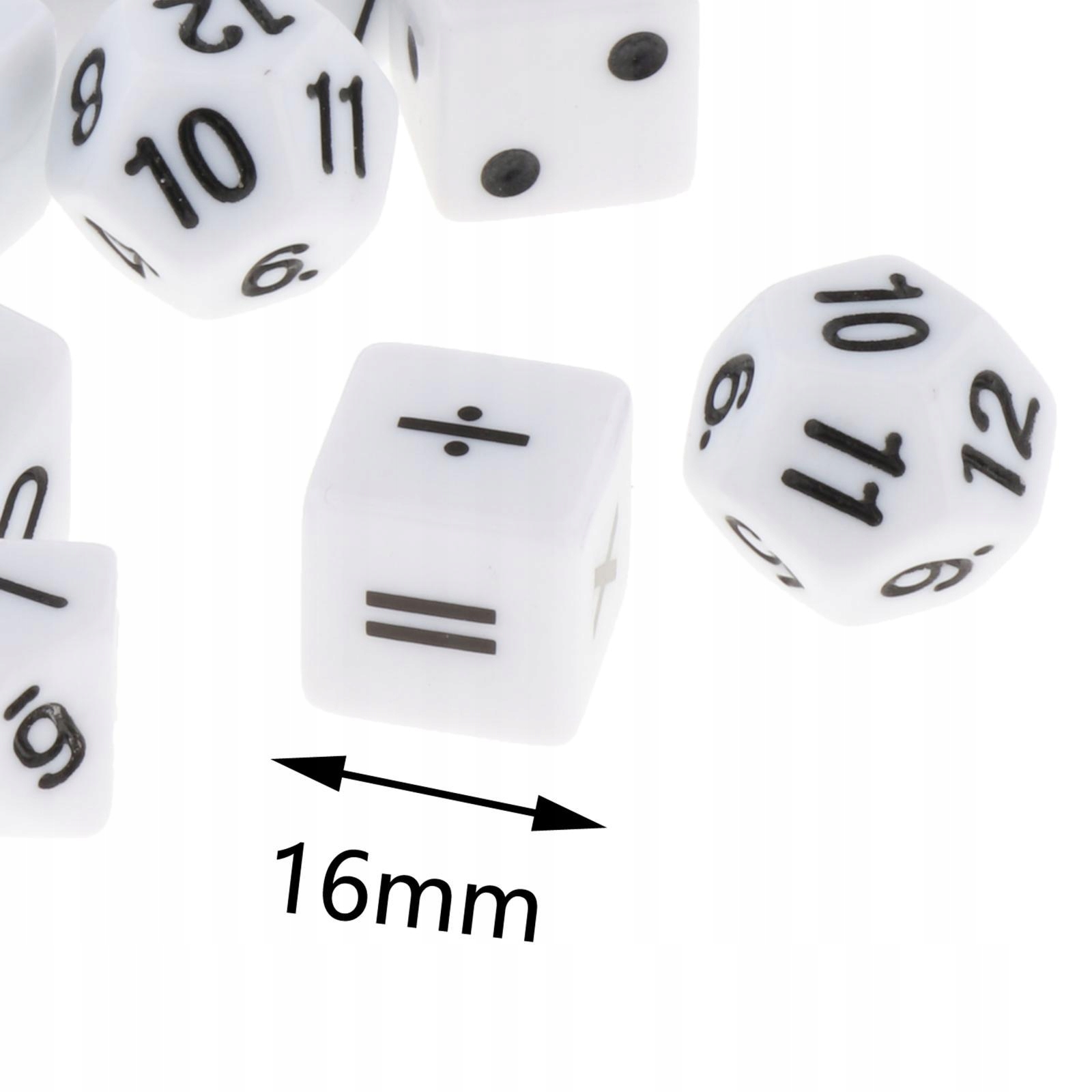 В набор входят 6 6-сторонних математических операций, 6 6-сторонних точек, 6 10-сторонних, 6 12-сторонних.