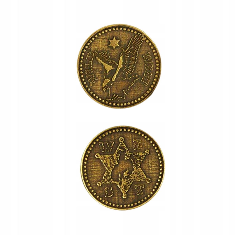 изготовлен из цинк сплавов, набор из 24 замечательных, тяжелых монет, который представляет мотивы, связанные с Диким Западом.