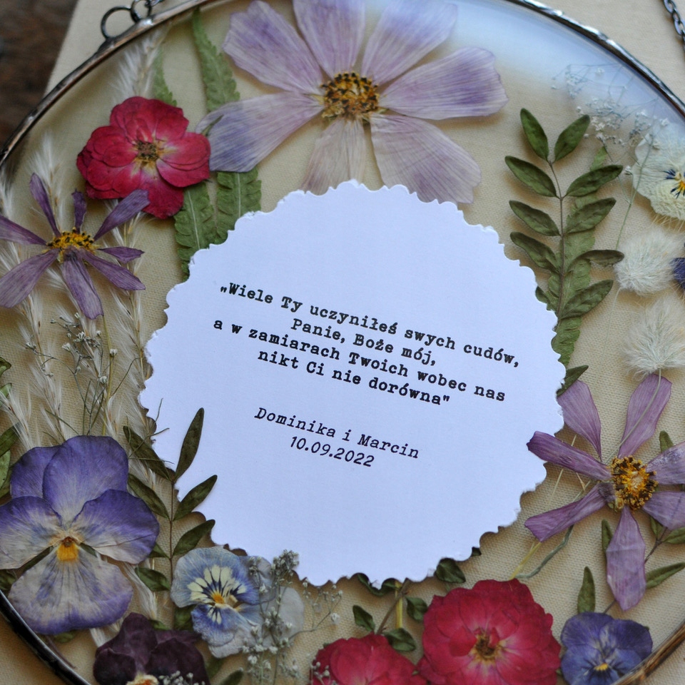 Различные сухоцветы вложены в оригинальный декоративный узор, переплетенный с печатным текстом.