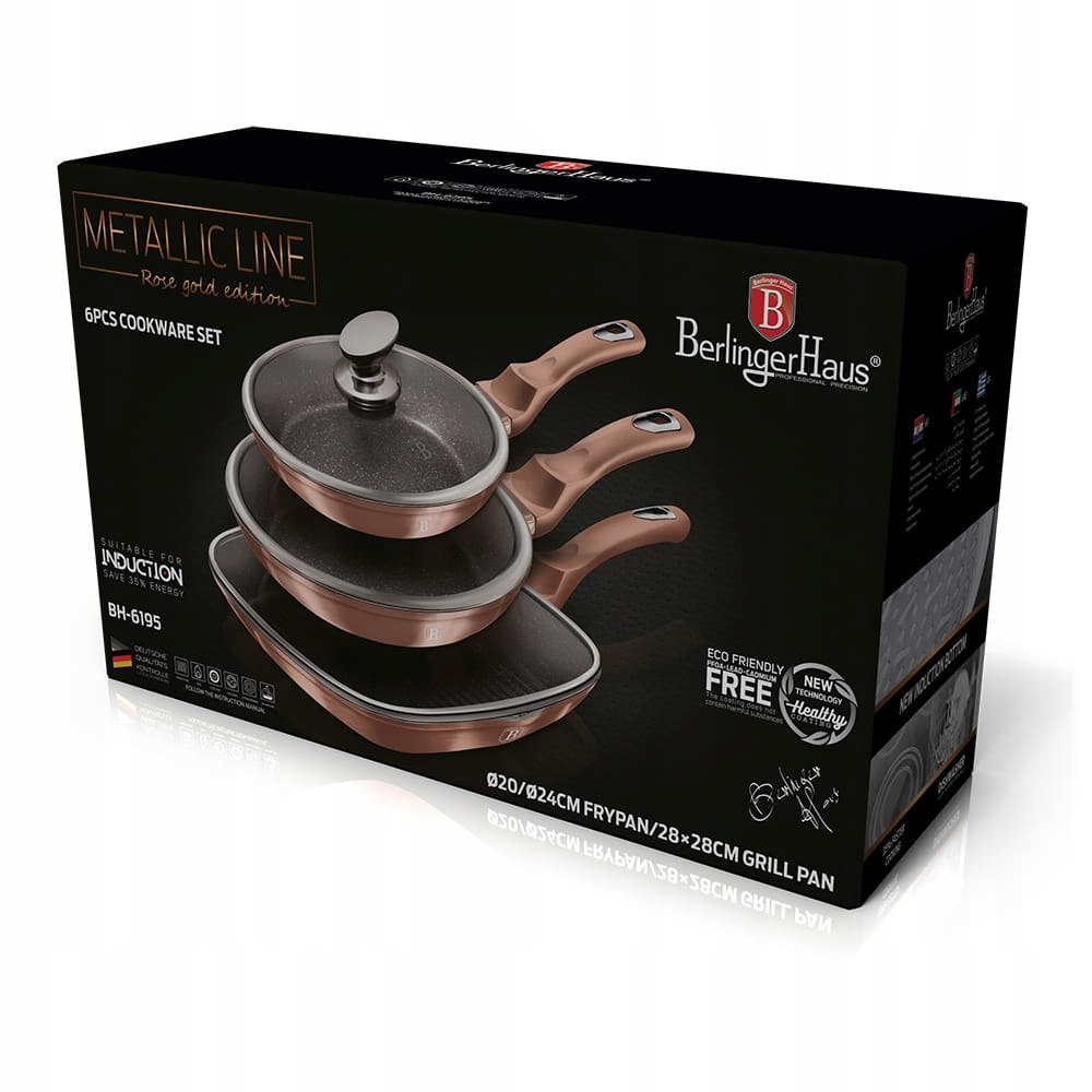 Кастрюли и аксессуары серии METALLIC от BERLINGER HAUS изготовлены из высококачественного кованого алюминия, покрытого тройным гранитным покрытием (мрамором) с очень высоким коэффициентом твердости. Внешнее покрытие доступно в нескольких цветах с характерным металлическим блеском. Эта привлекательная и модная посуда стандартно оснащена ручками SOFT TOUCH (силиконовая ручка). Подходит для всех типов плит: газовых, электрических, керамических, галогенных, индукционных. Система TURBO INDUCTION (они очень быстро нагреваются) позволяет экономить до 35% энергии.